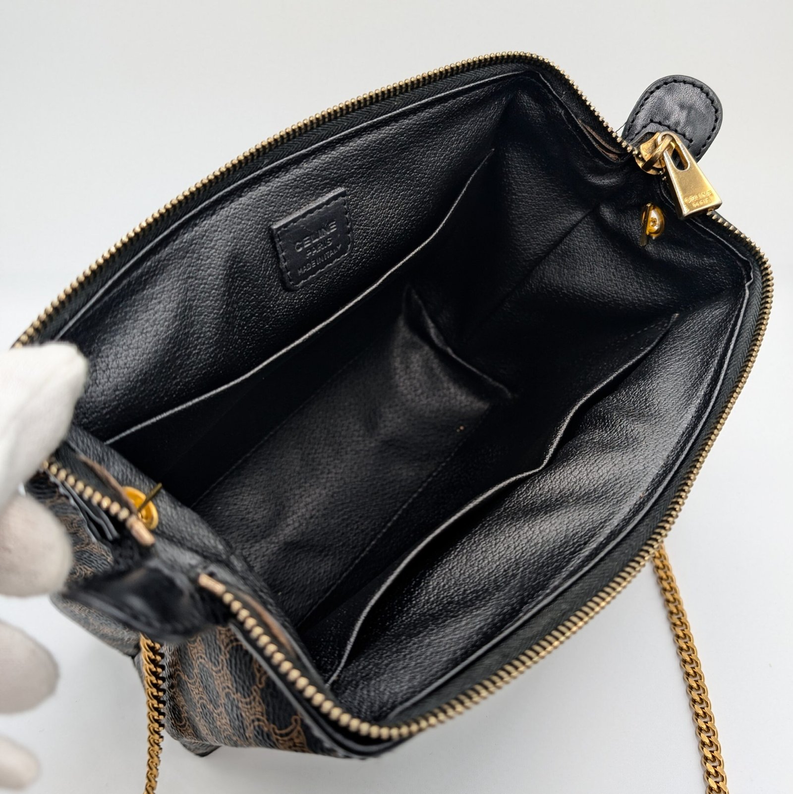 Two eyelets and a gold-plated stainless steel chain, not original and removable, have been added, allowing it to be worn as a shoulder bag or clutch bag.