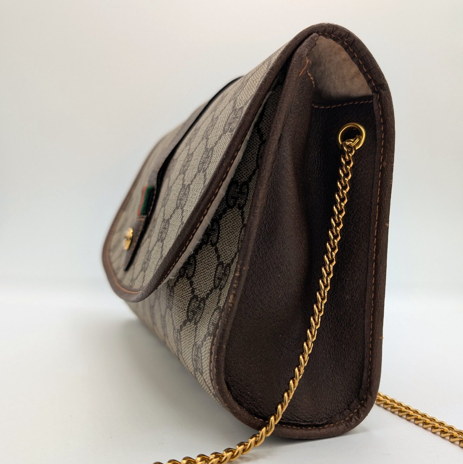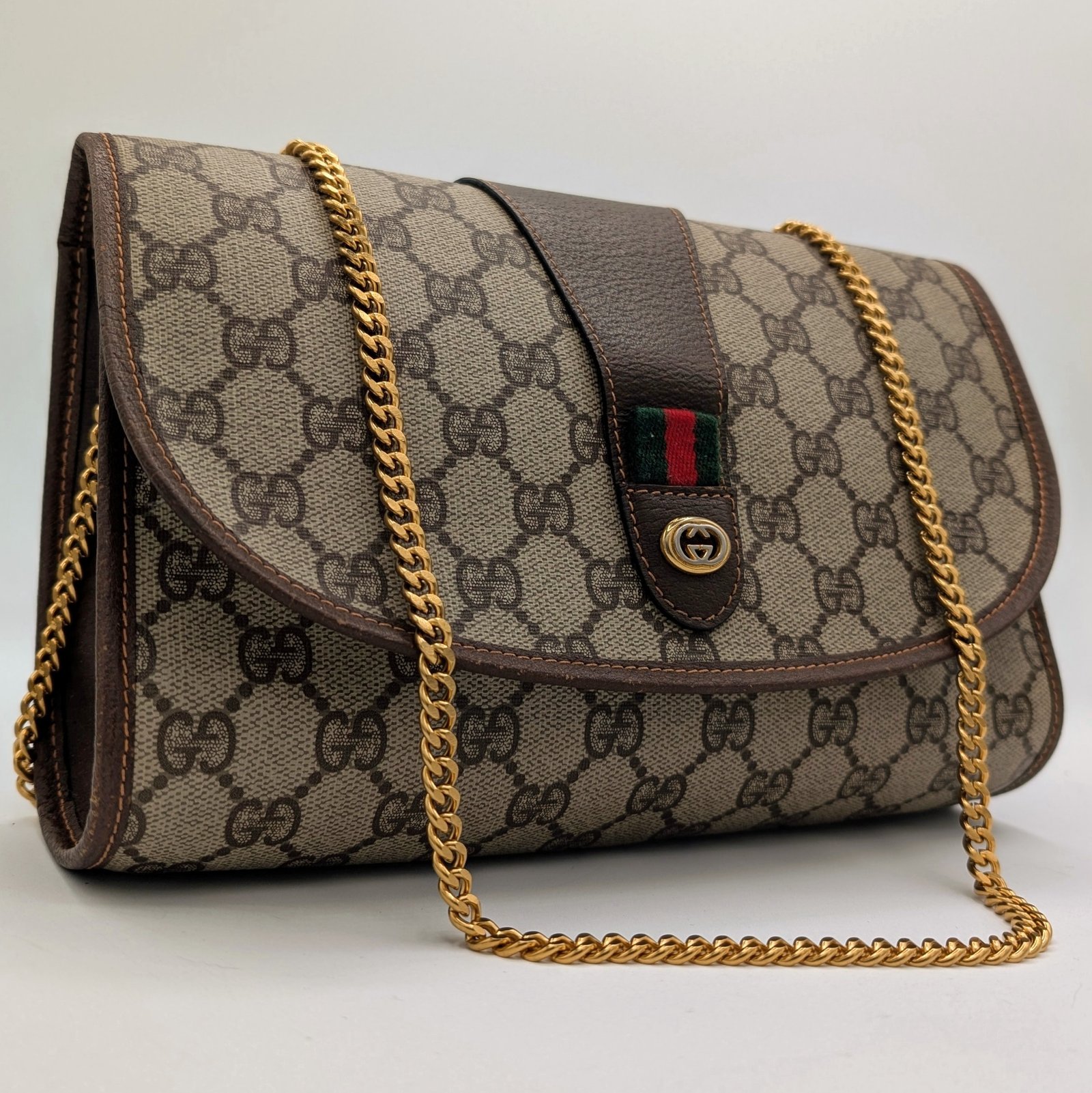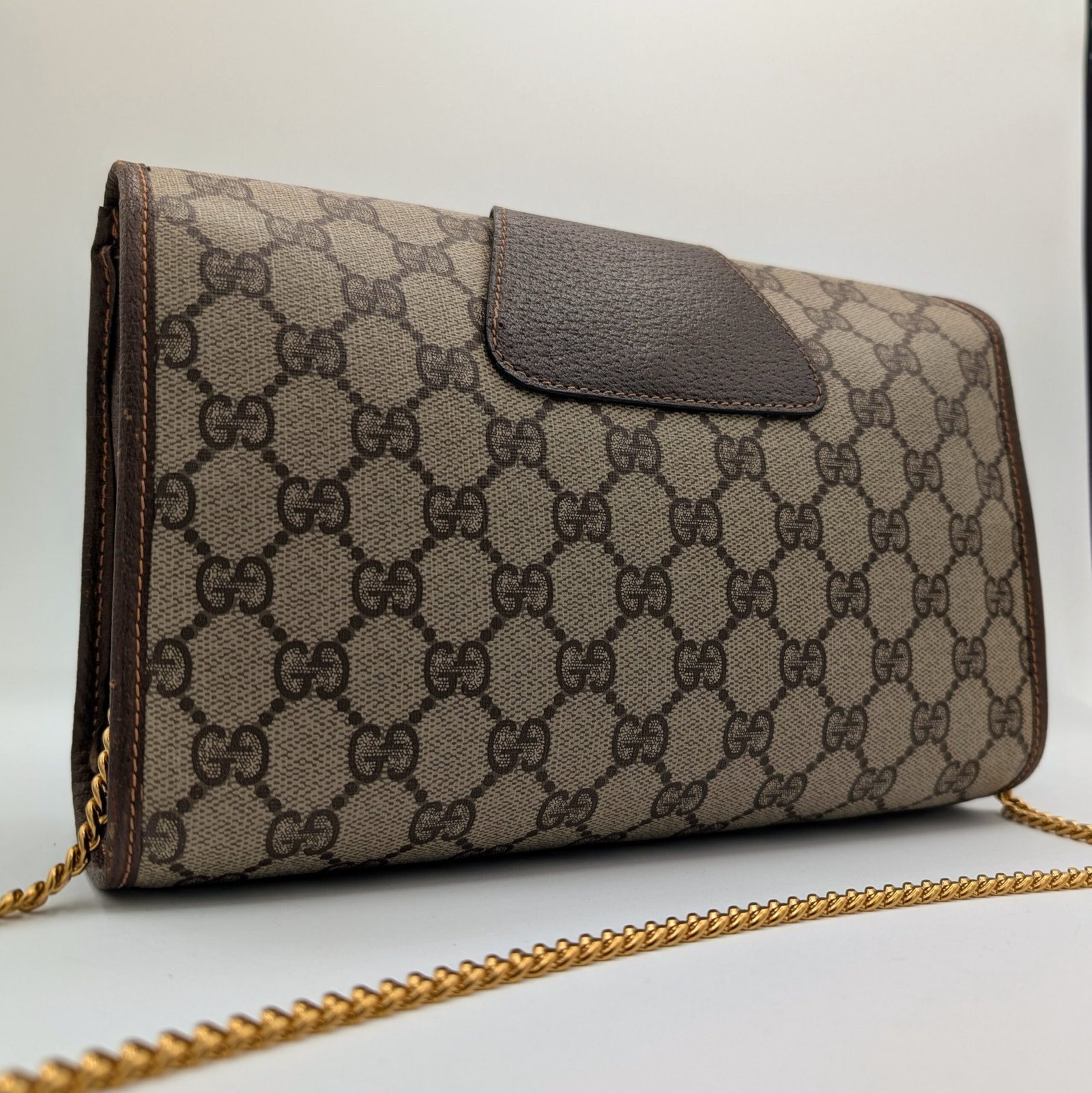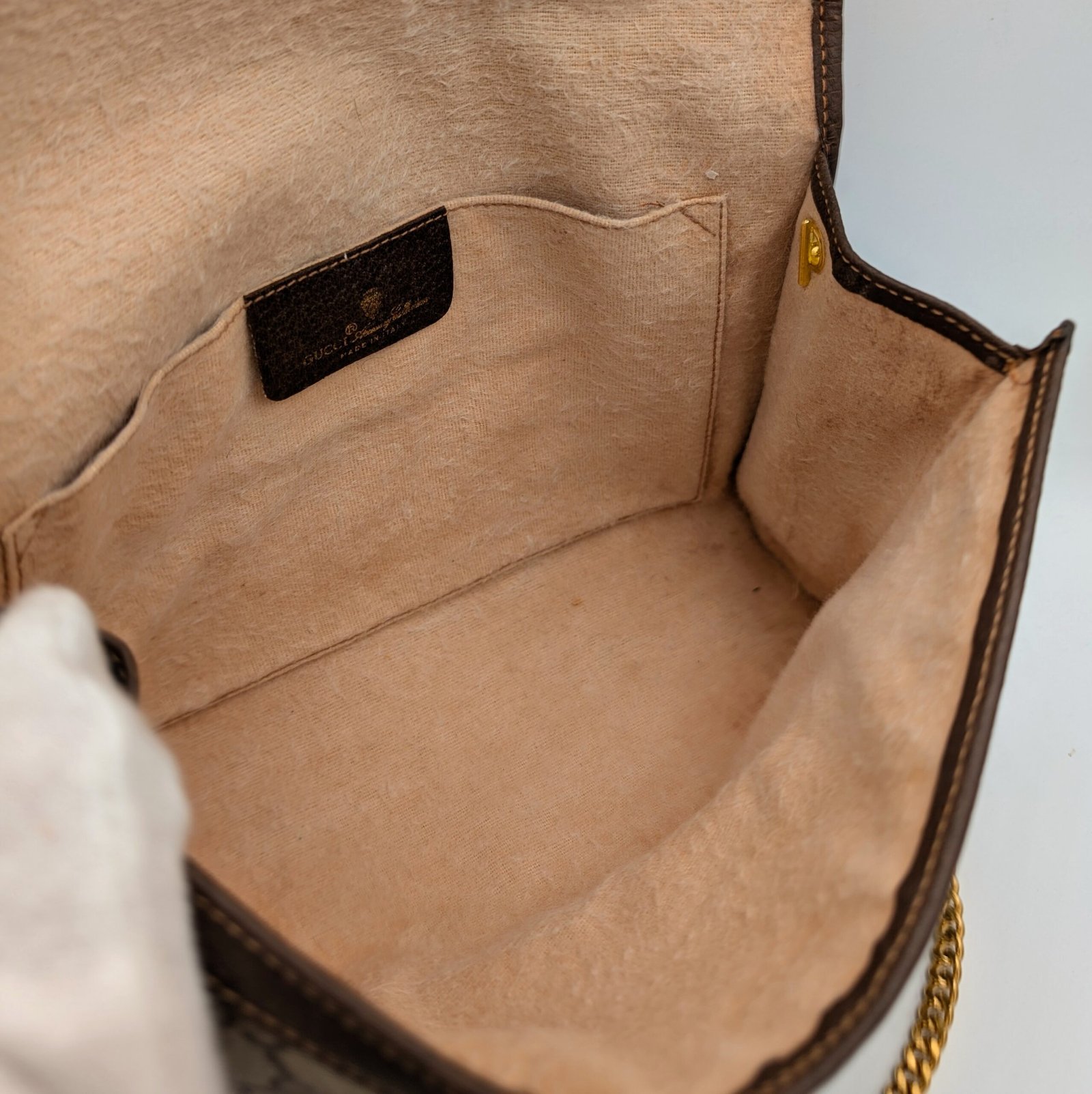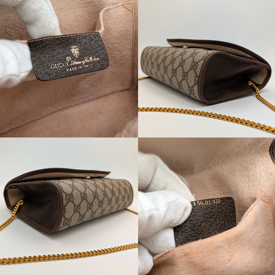 Two eyelets and a gold-plated stainless steel chain, not original and removable, have been added, allowing it to be worn as a shoulder bag or clutch bag.