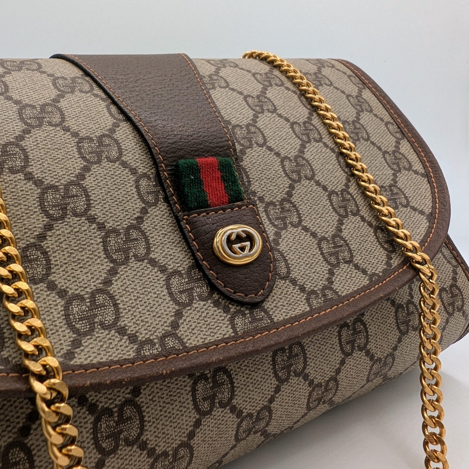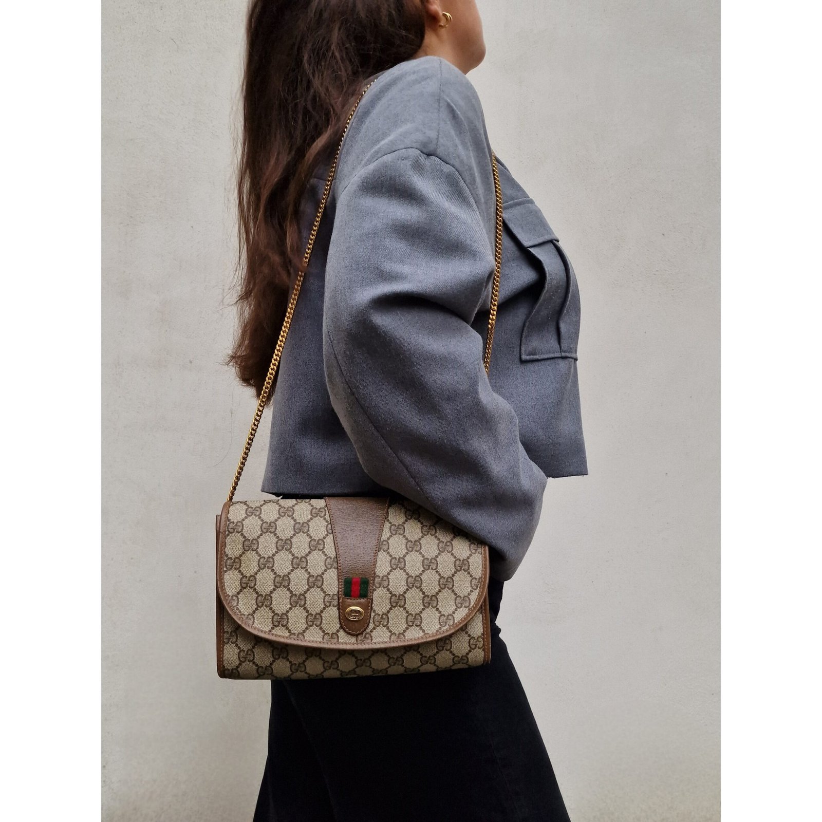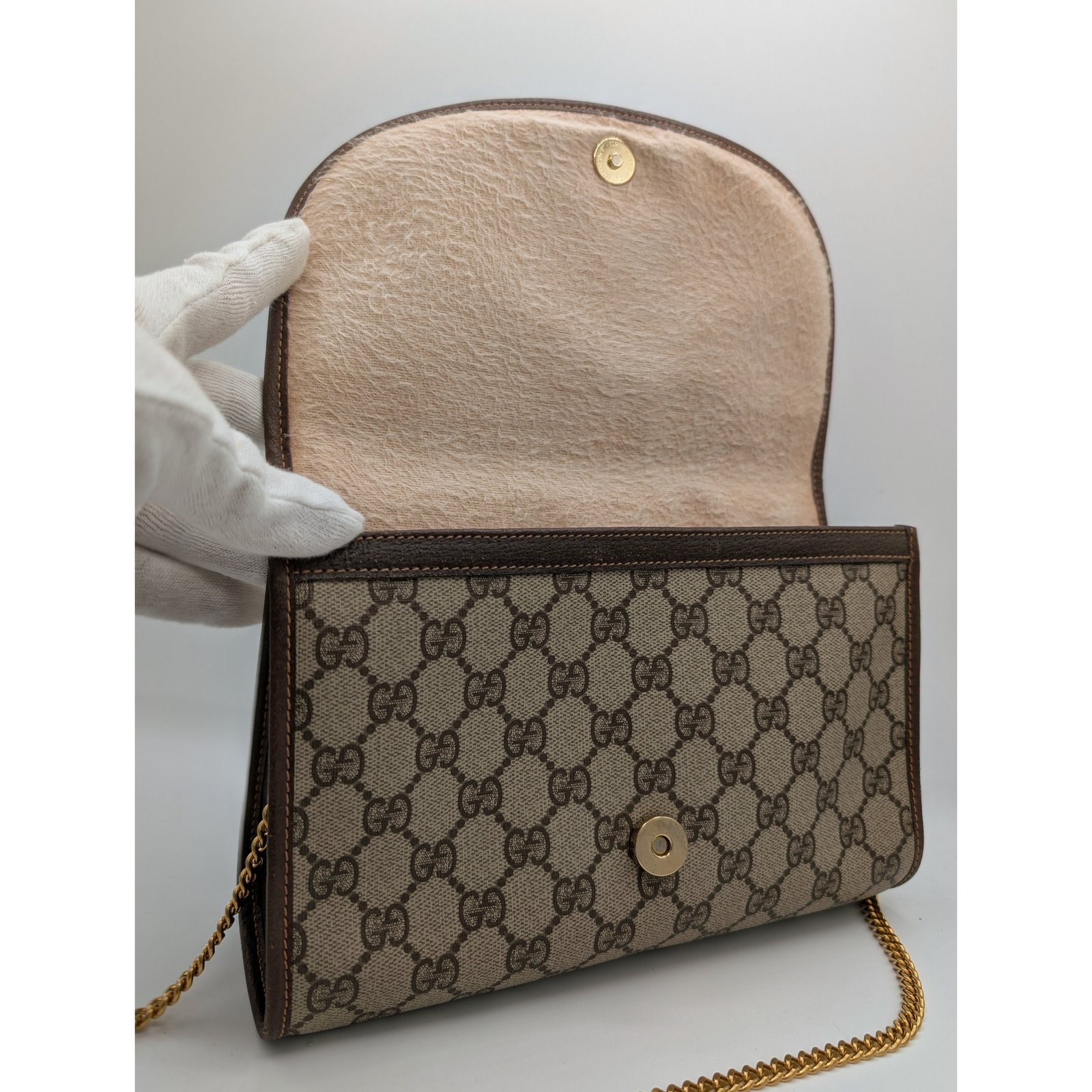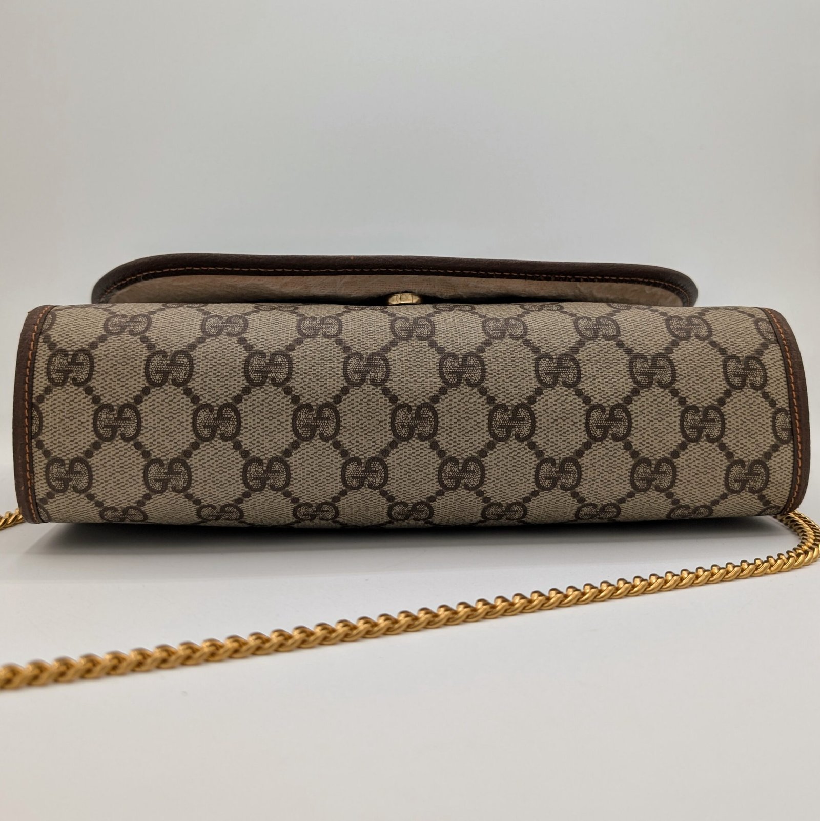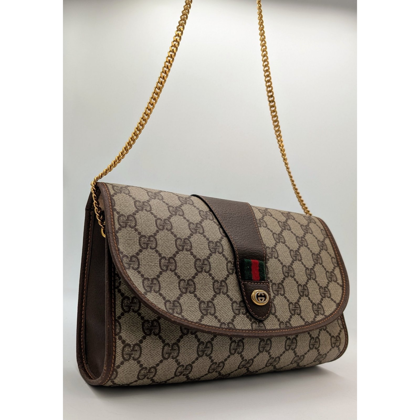 Two eyelets and a gold-plated stainless steel chain, not original and removable, have been added, allowing it to be worn as a shoulder bag or clutch bag.