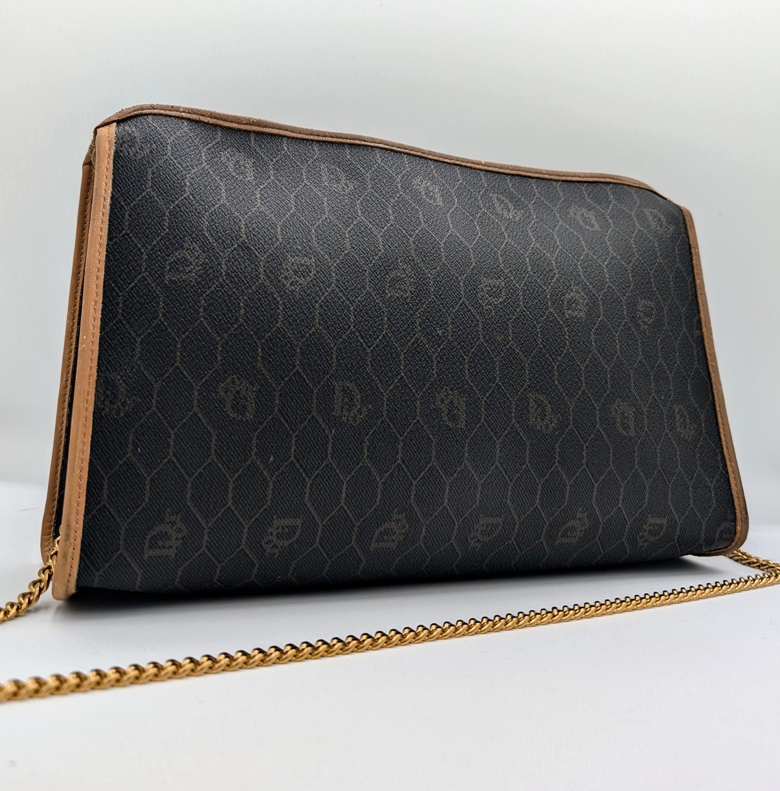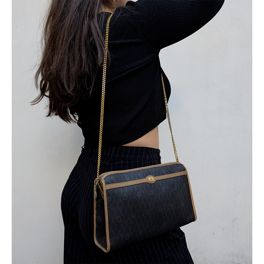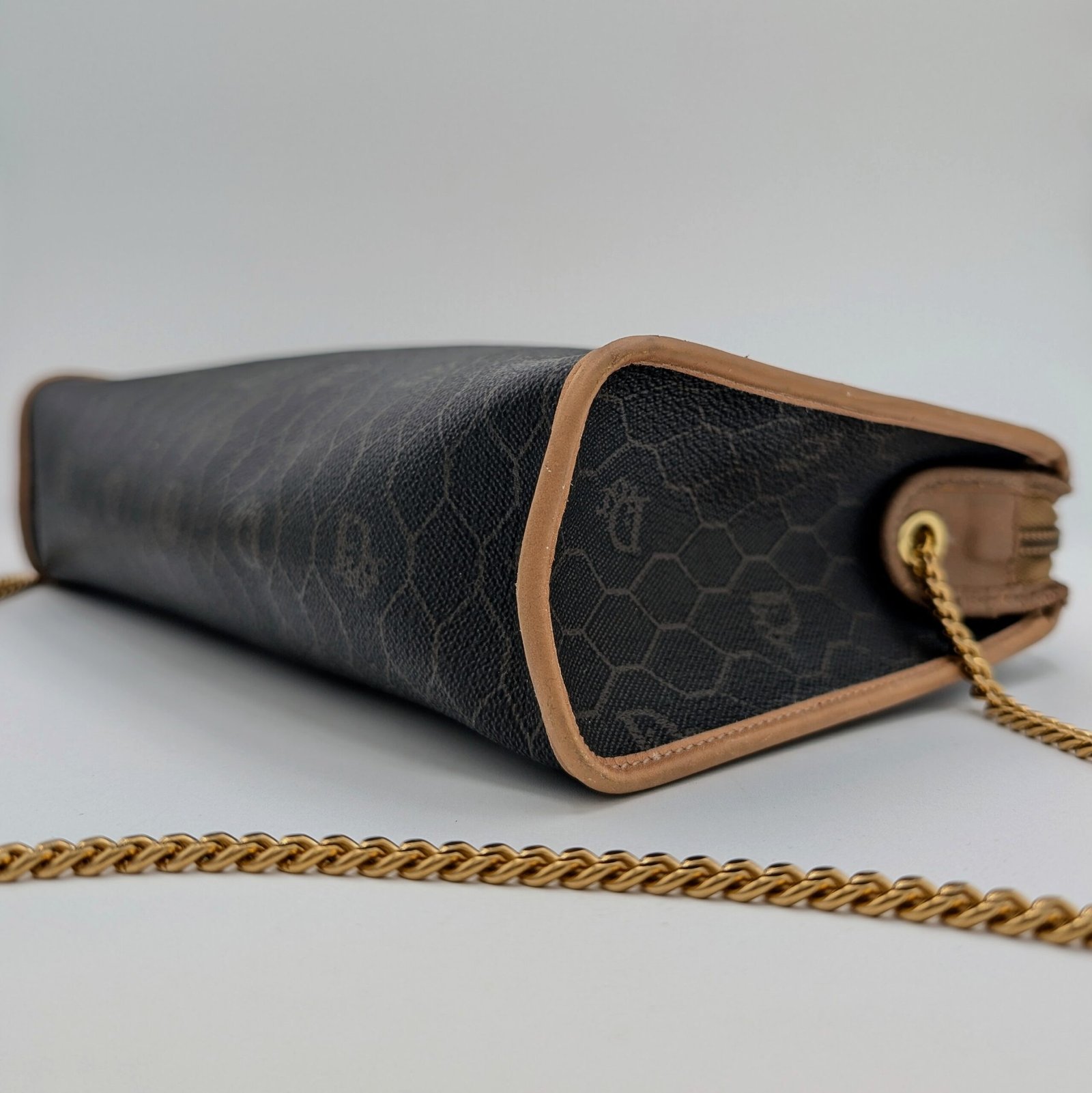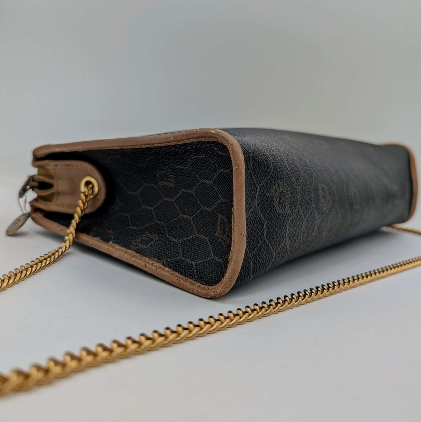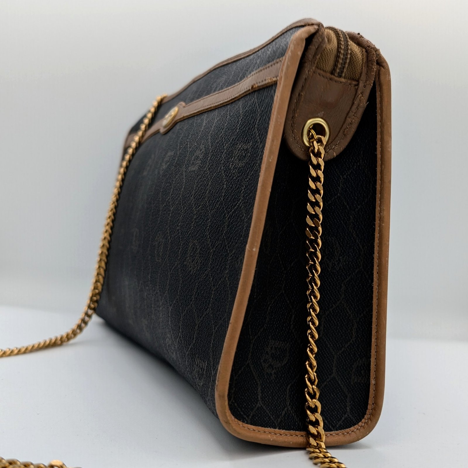Two eyelets and a gold-plated stainless steel chain, not original and removable, have been added, allowing it to be worn as a shoulder bag or clutch bag.