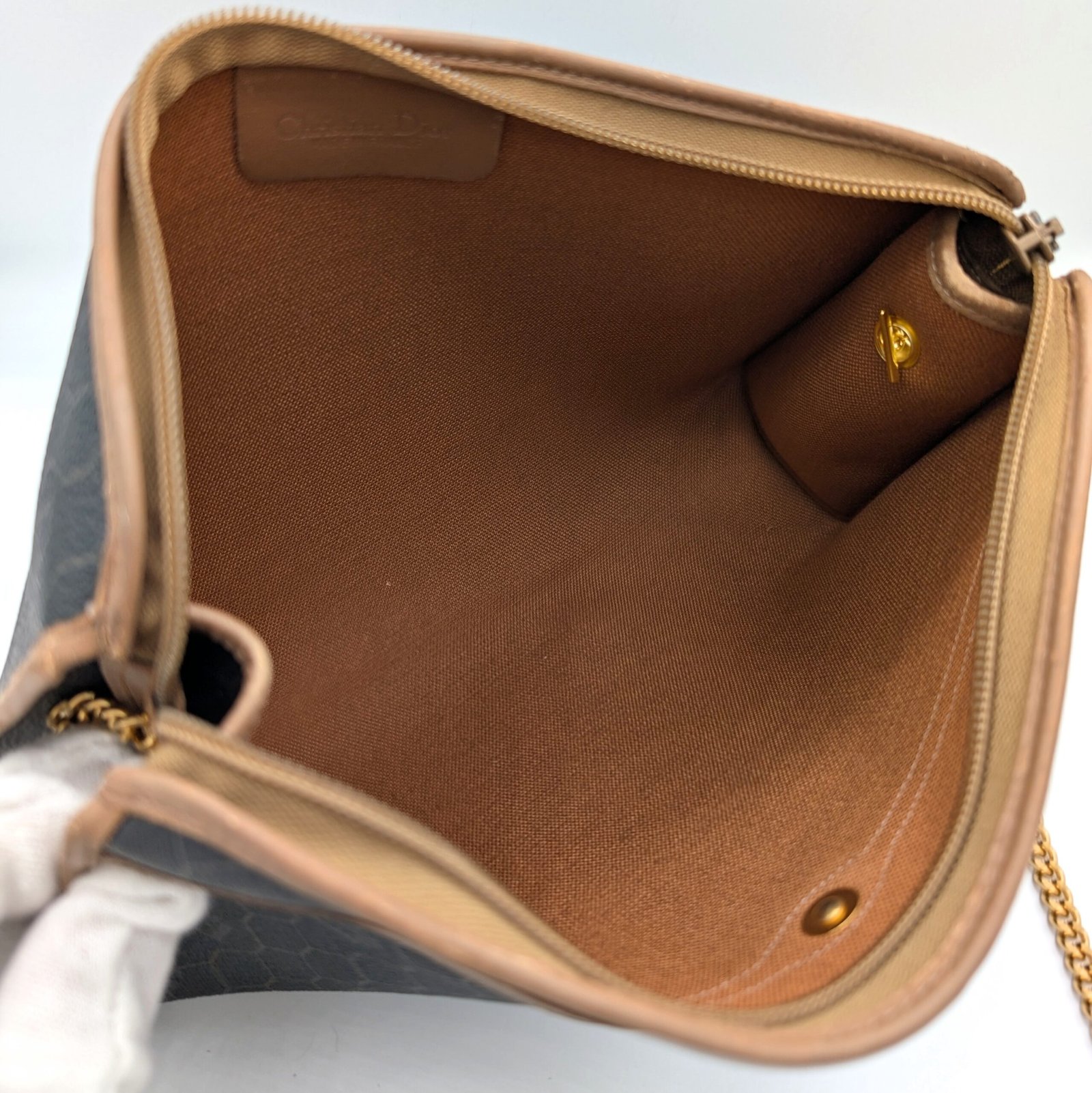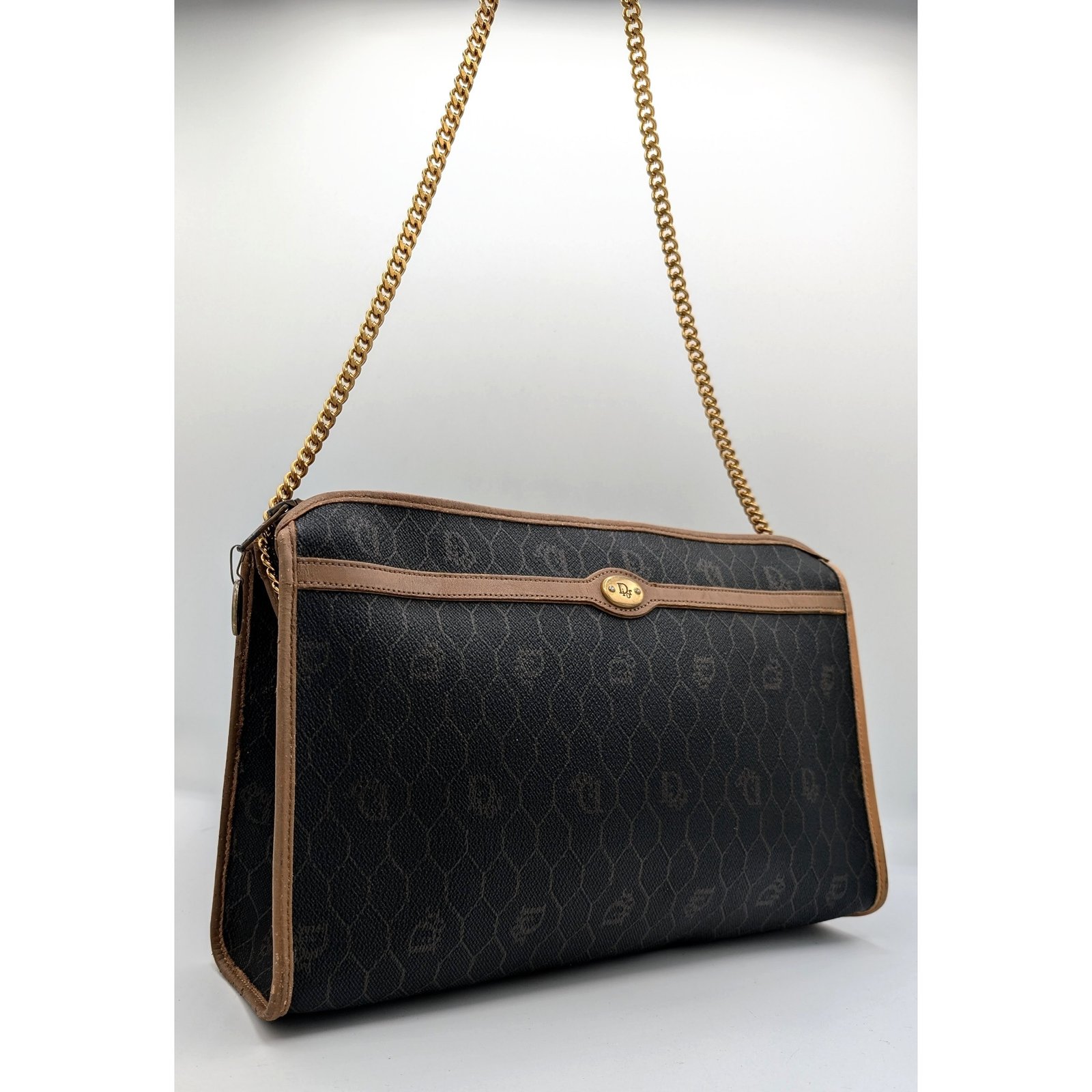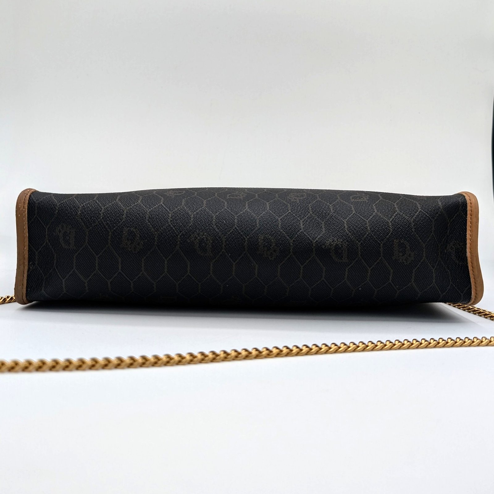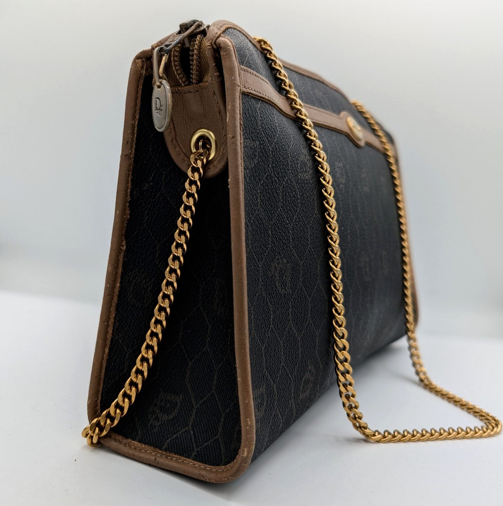 Two eyelets and a gold-plated stainless steel chain, not original and removable, have been added, allowing it to be worn as a shoulder bag or clutch bag.