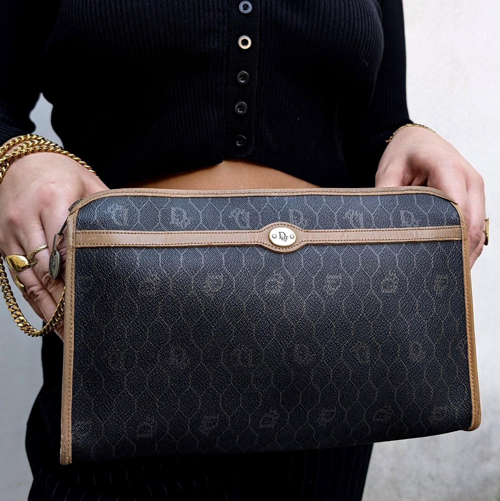 Beautiful Dior clutch bag with honeycomb pattern.
