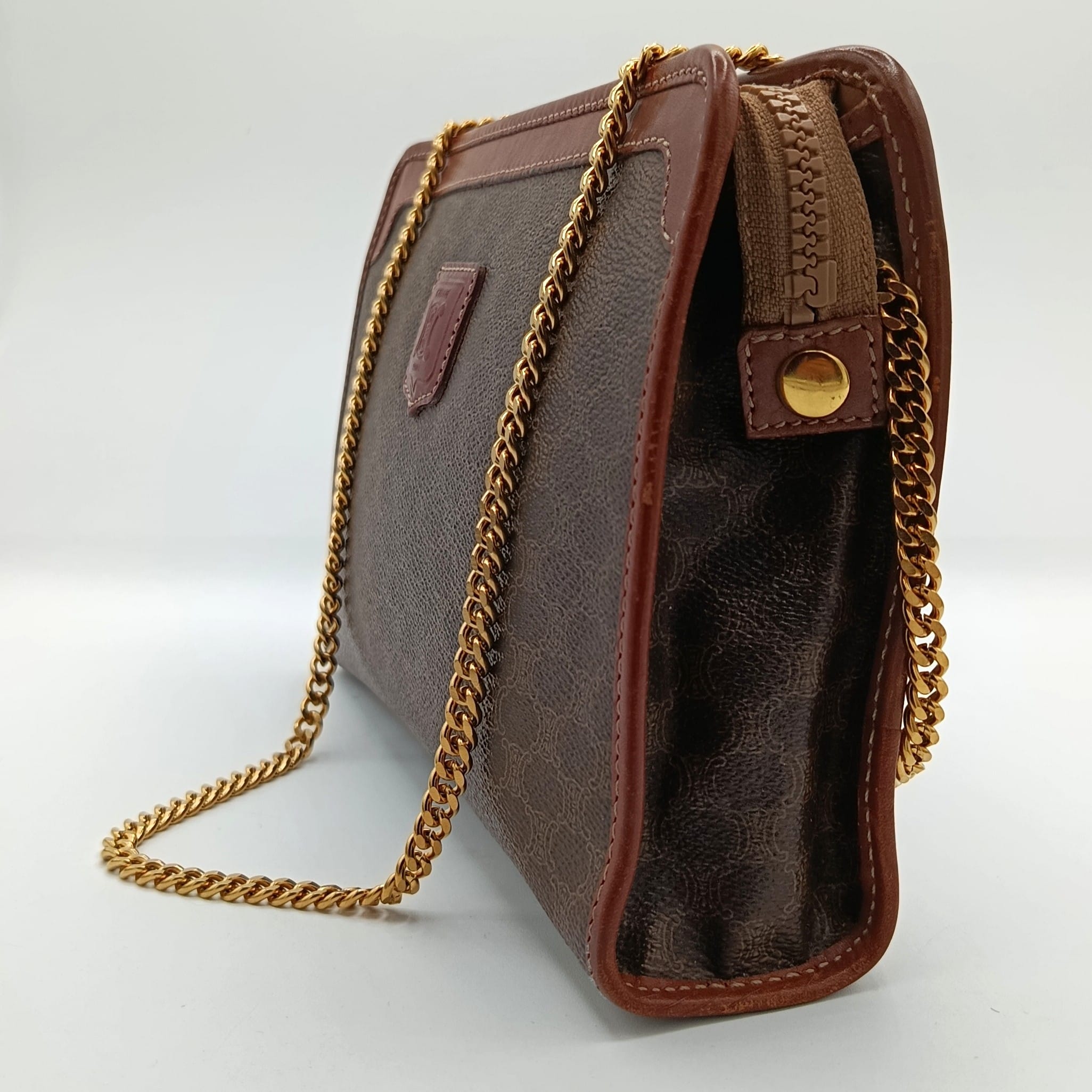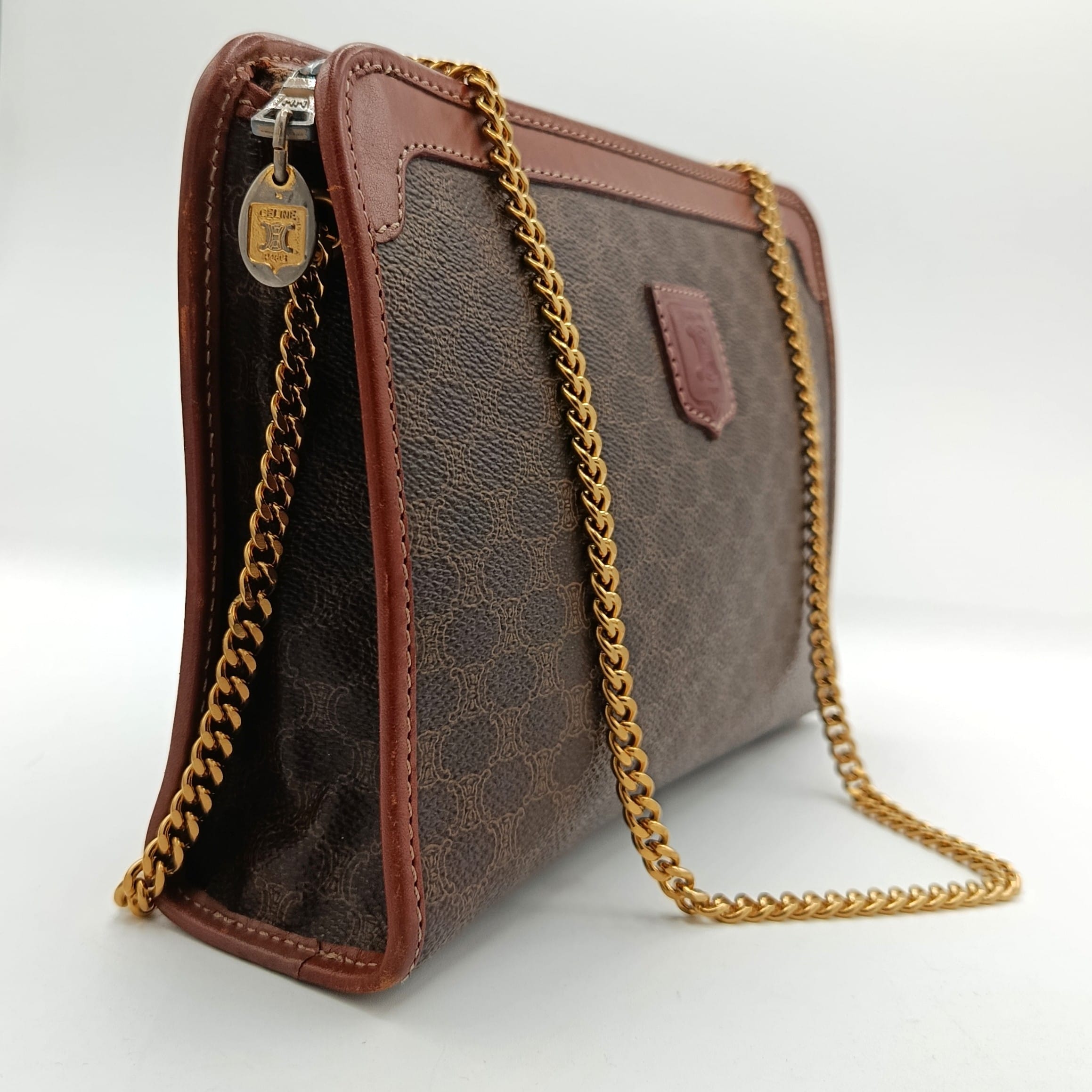 Two eyelets and a gold-tone stainless steel chain have been added; the chain is not original and is removable, allowing the bag to be worn as a shoulder bag or a clutch.