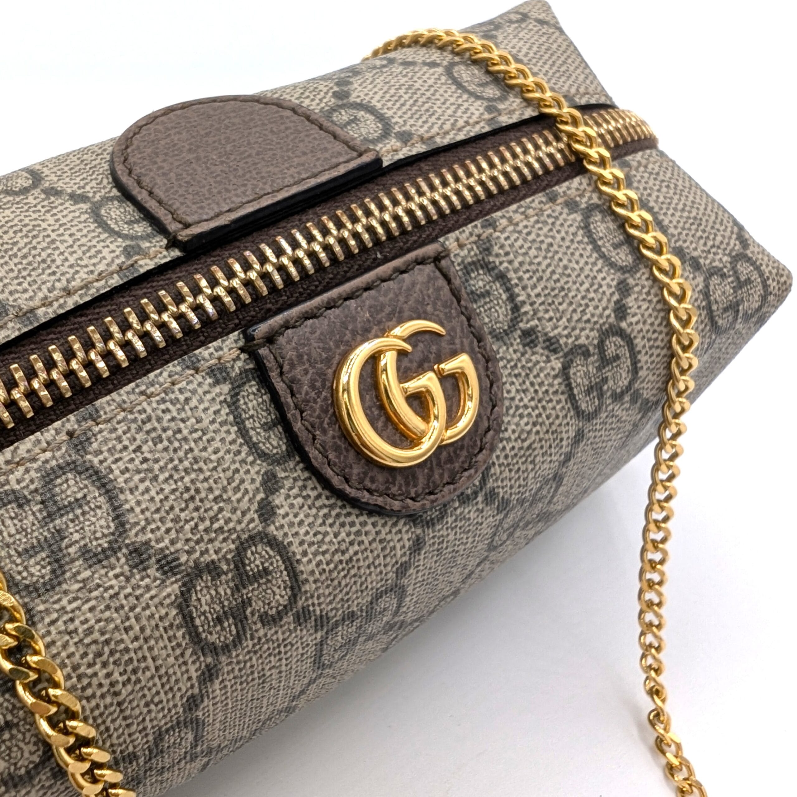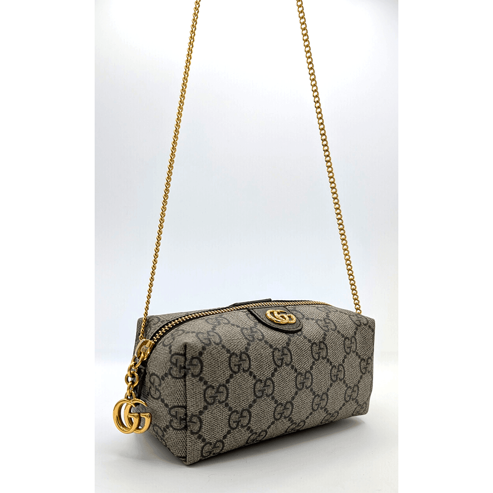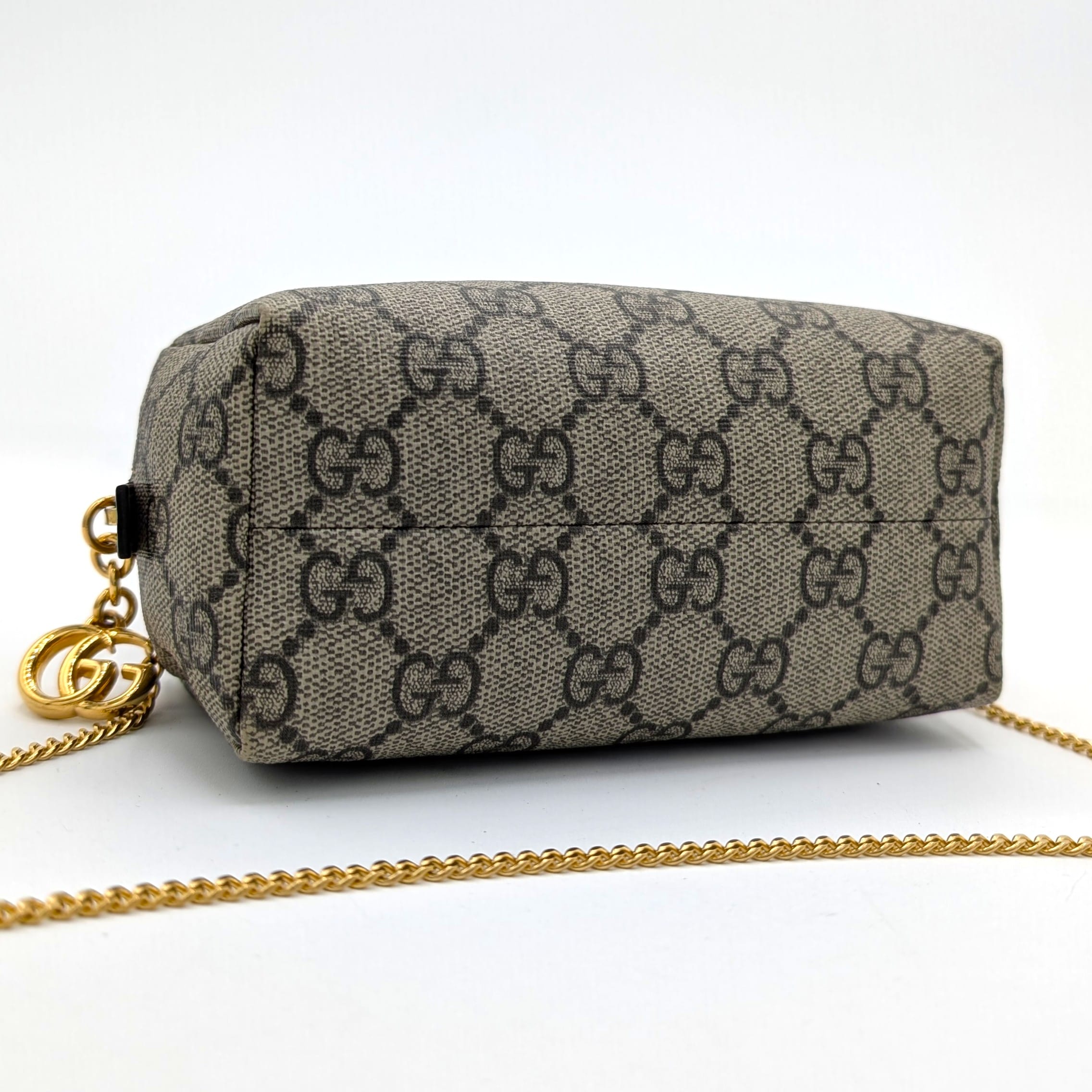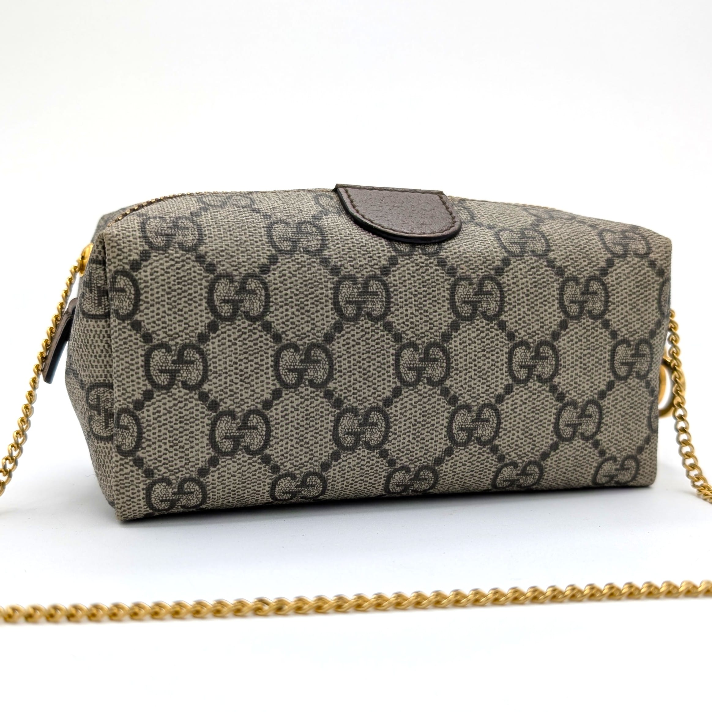Two eyelets and a gold-tone stainless steel chain have been added; the chain is not original and is removable, allowing the bag to be worn as a shoulder bag or a clutch.