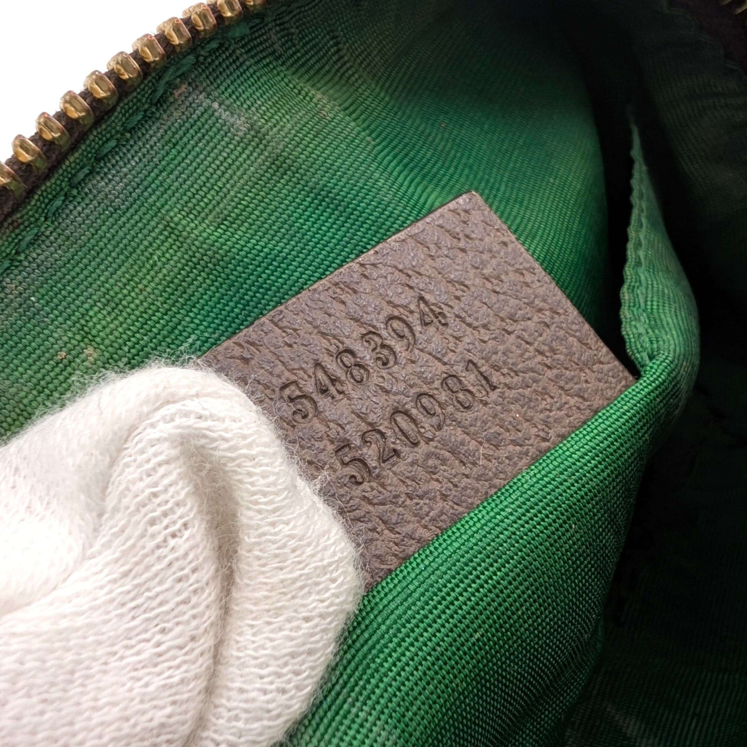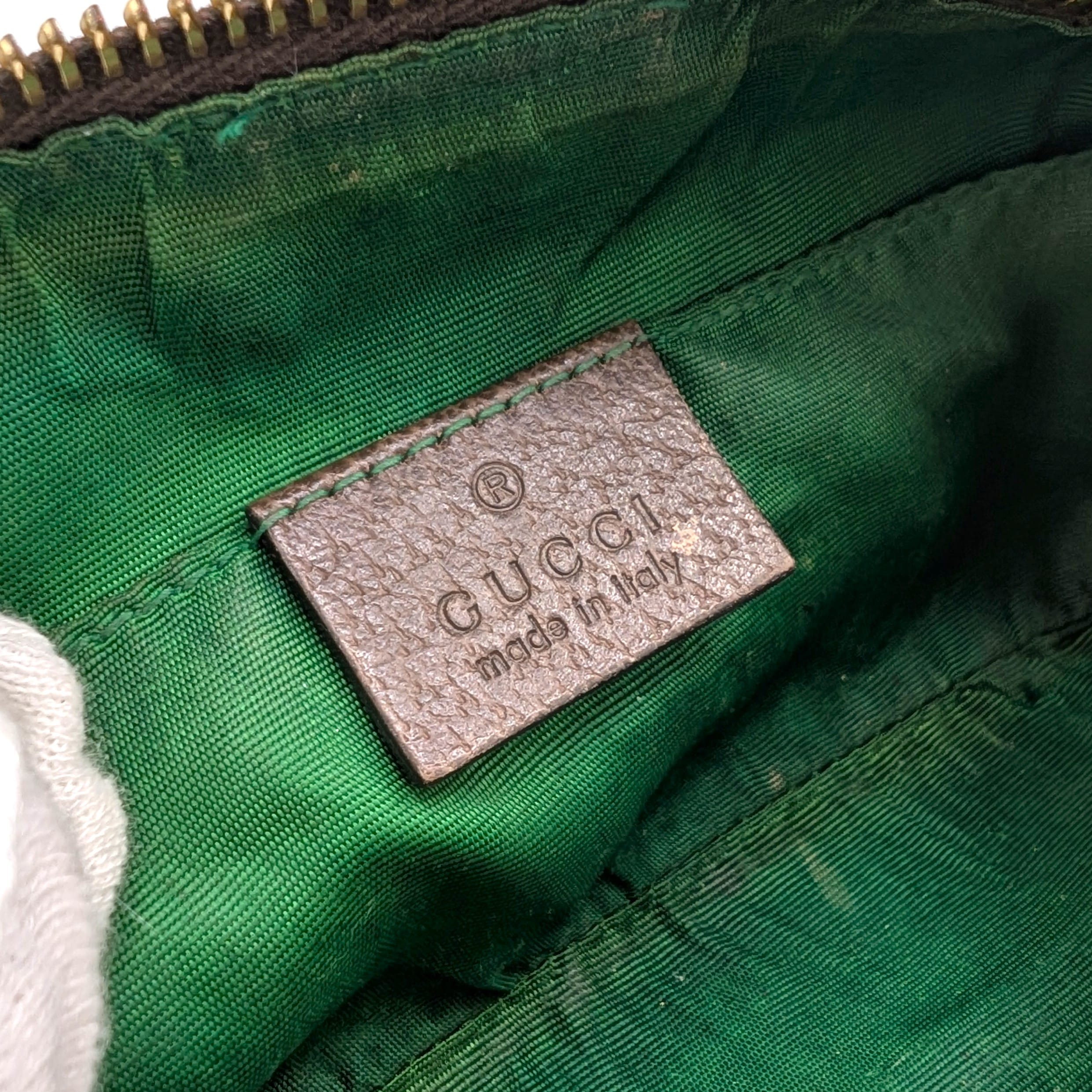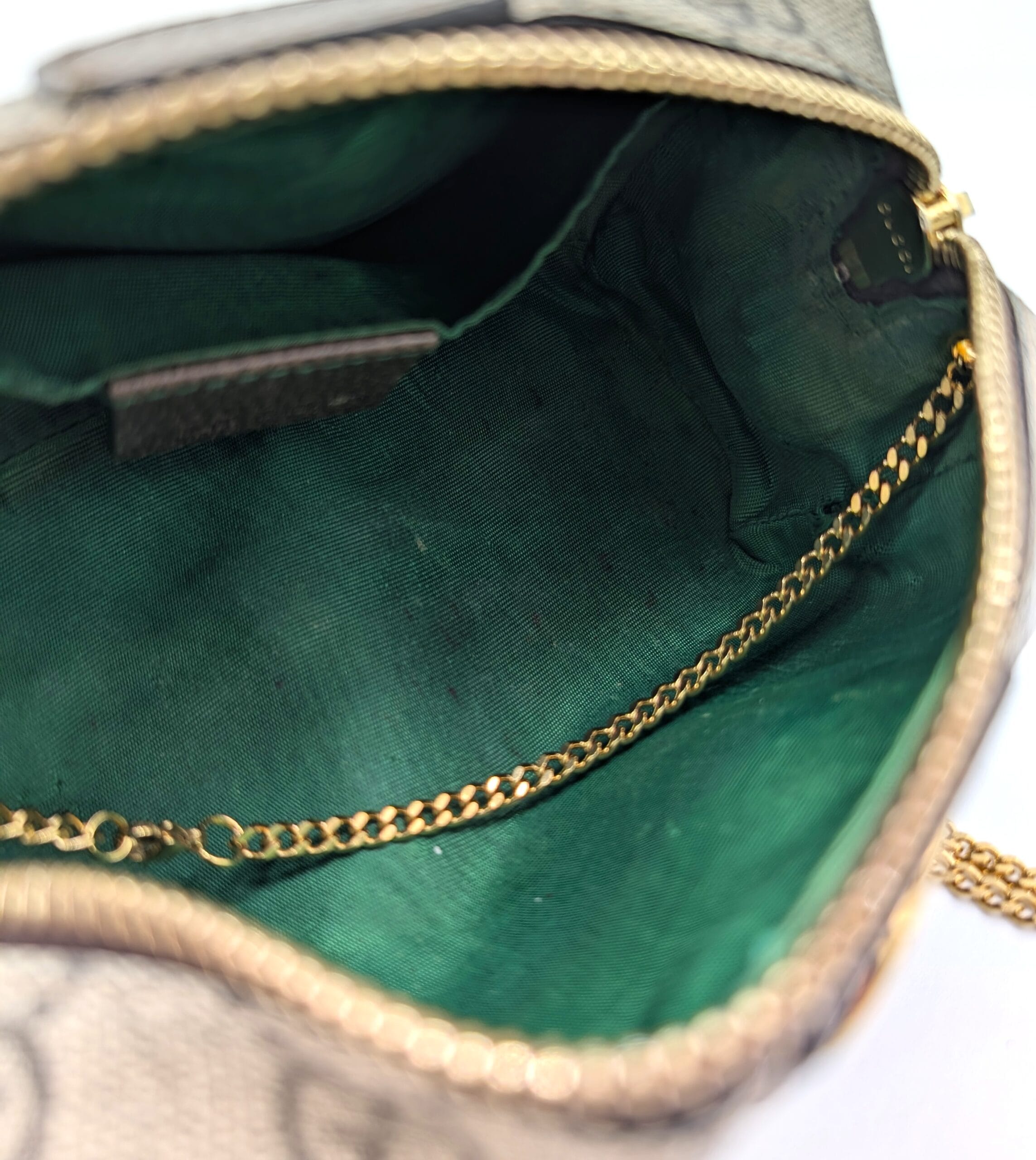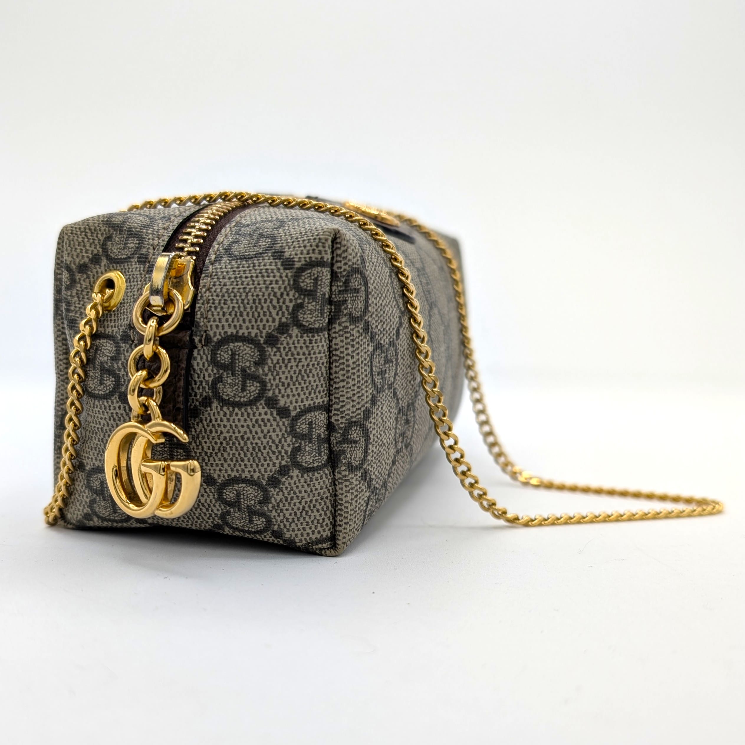 Two eyelets and a gold-tone stainless steel chain have been added; the chain is not original and is removable, allowing the bag to be worn as a shoulder bag or a clutch.