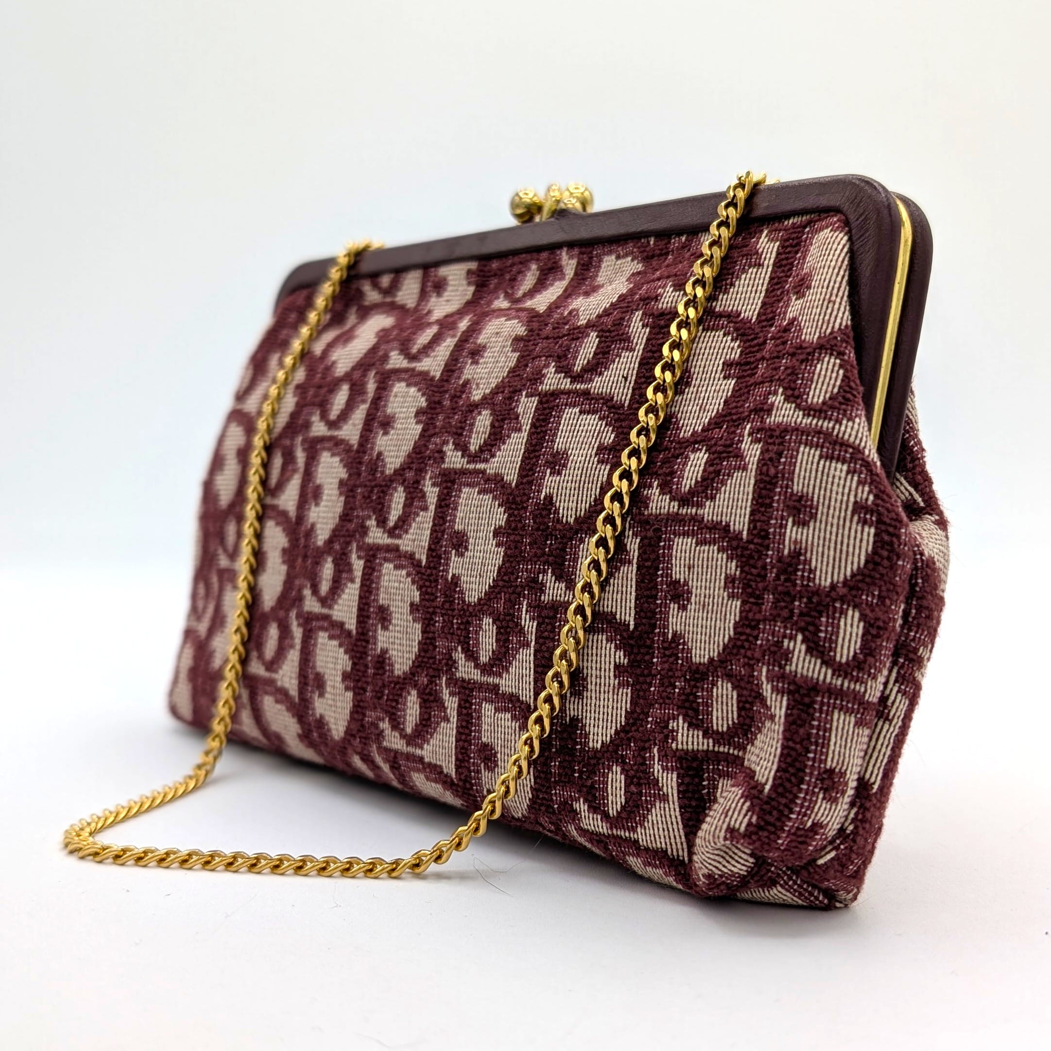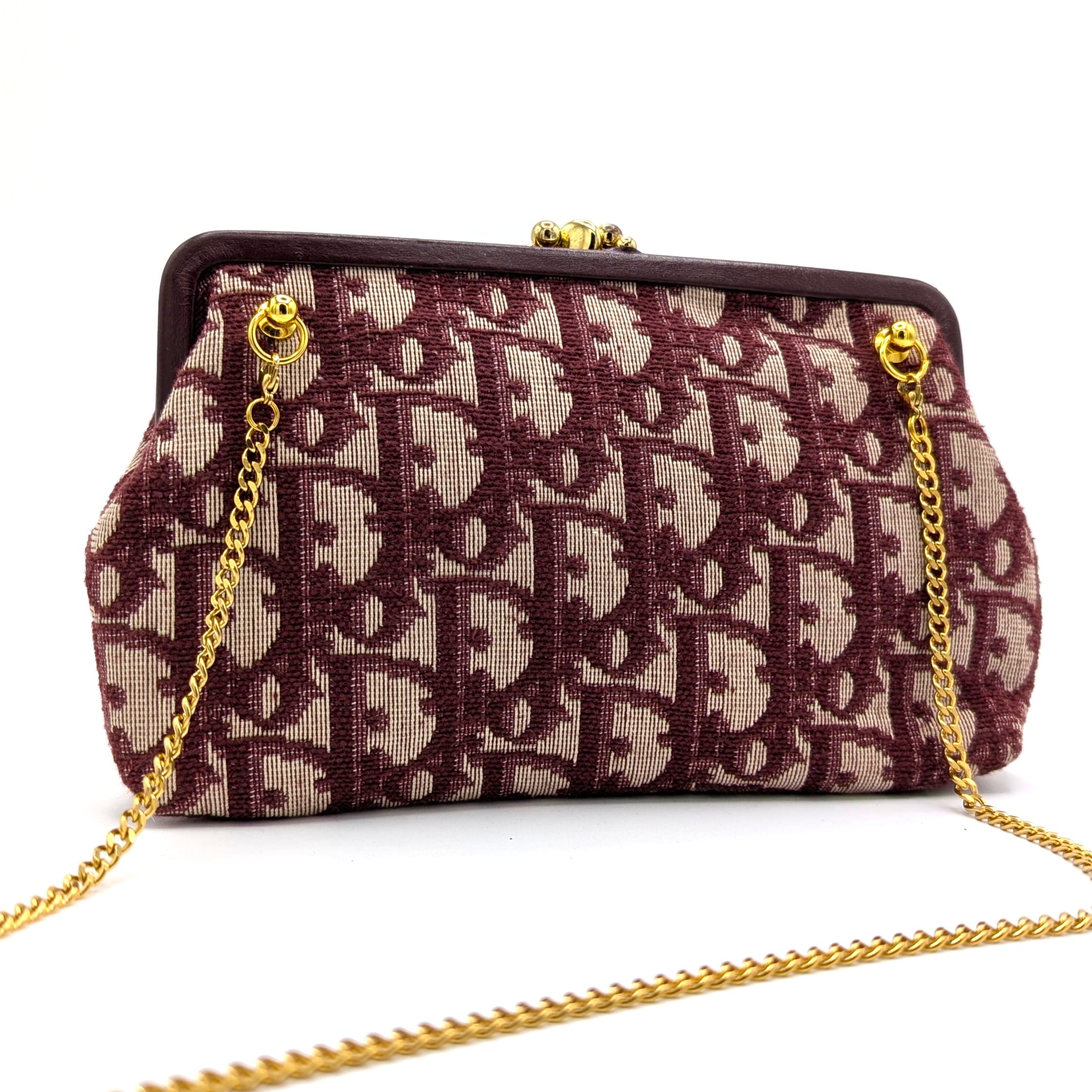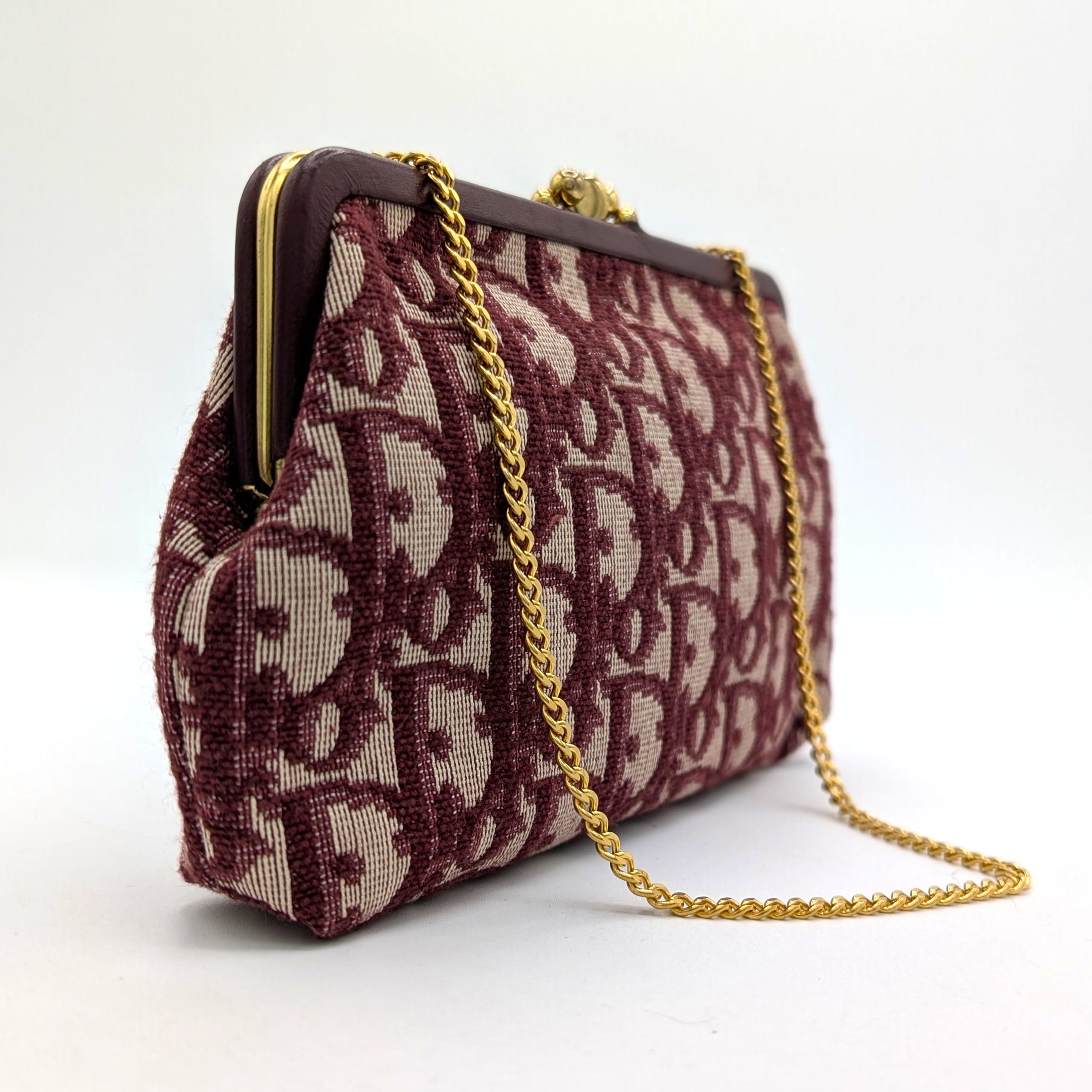 Colors: Bordeaux/beige. Gold hardware.