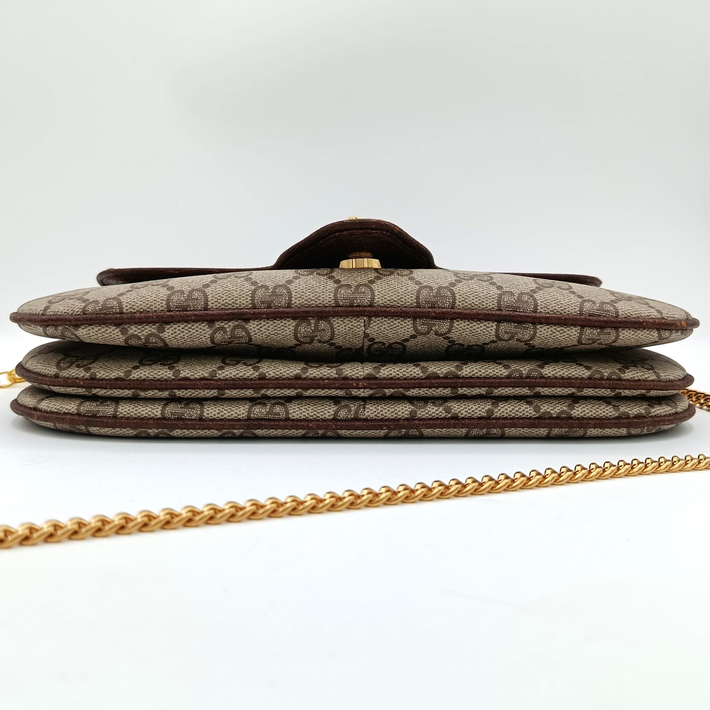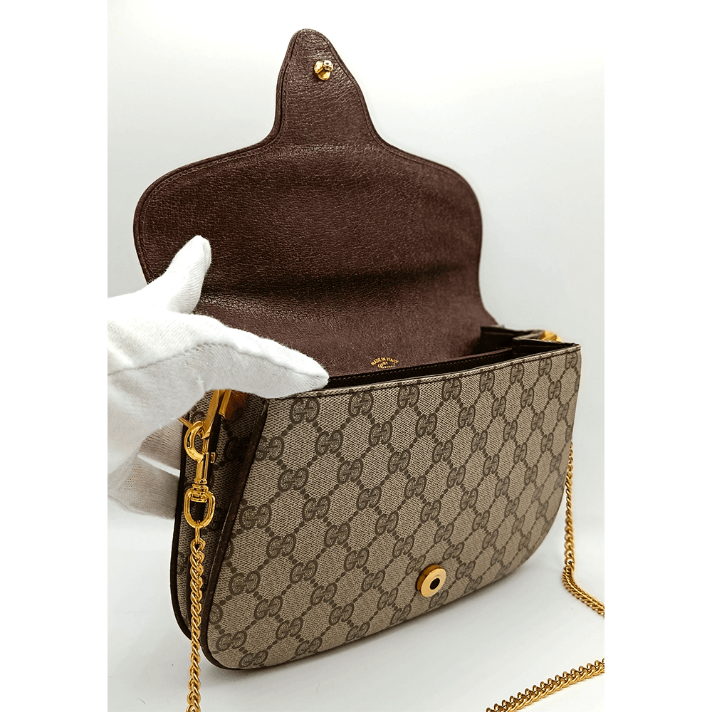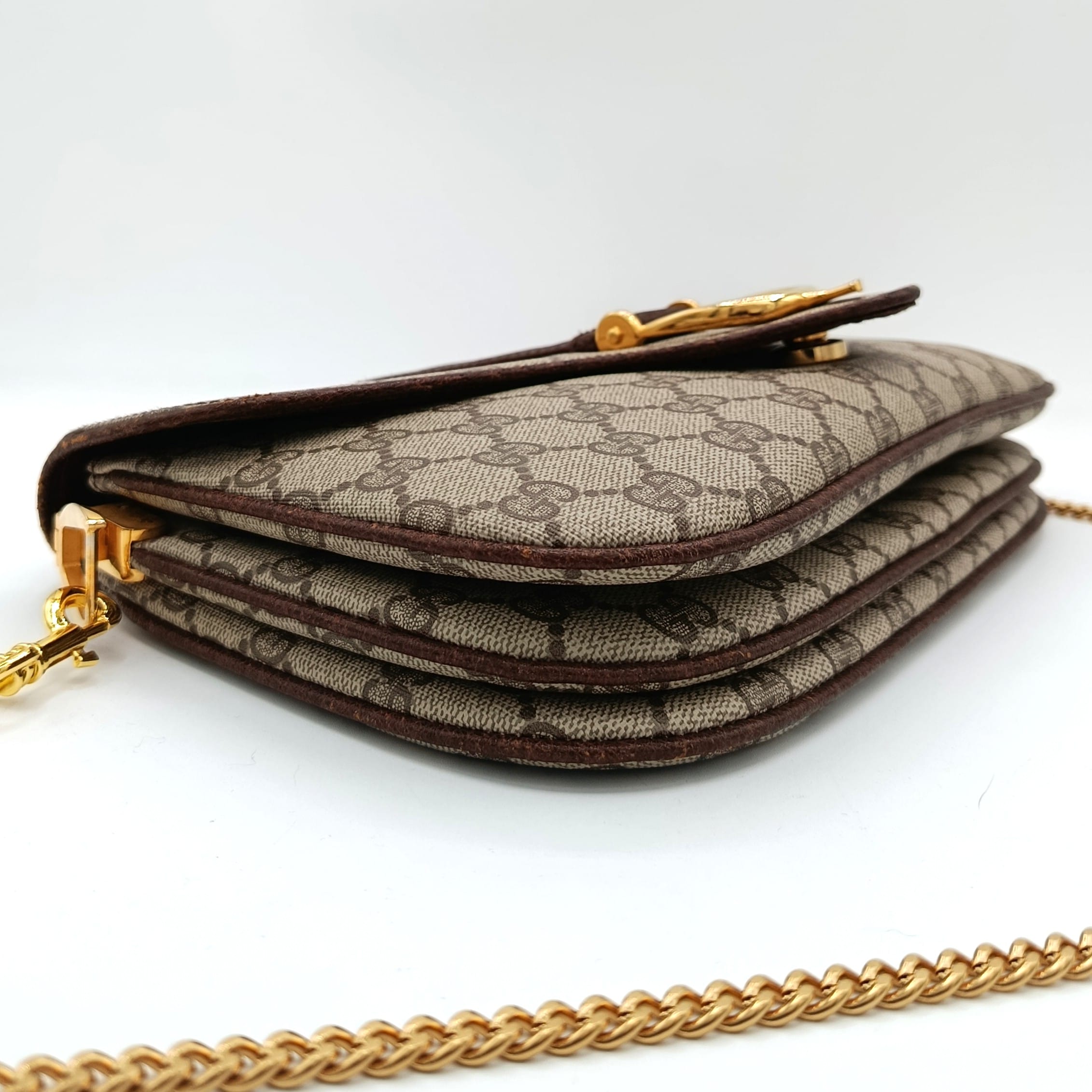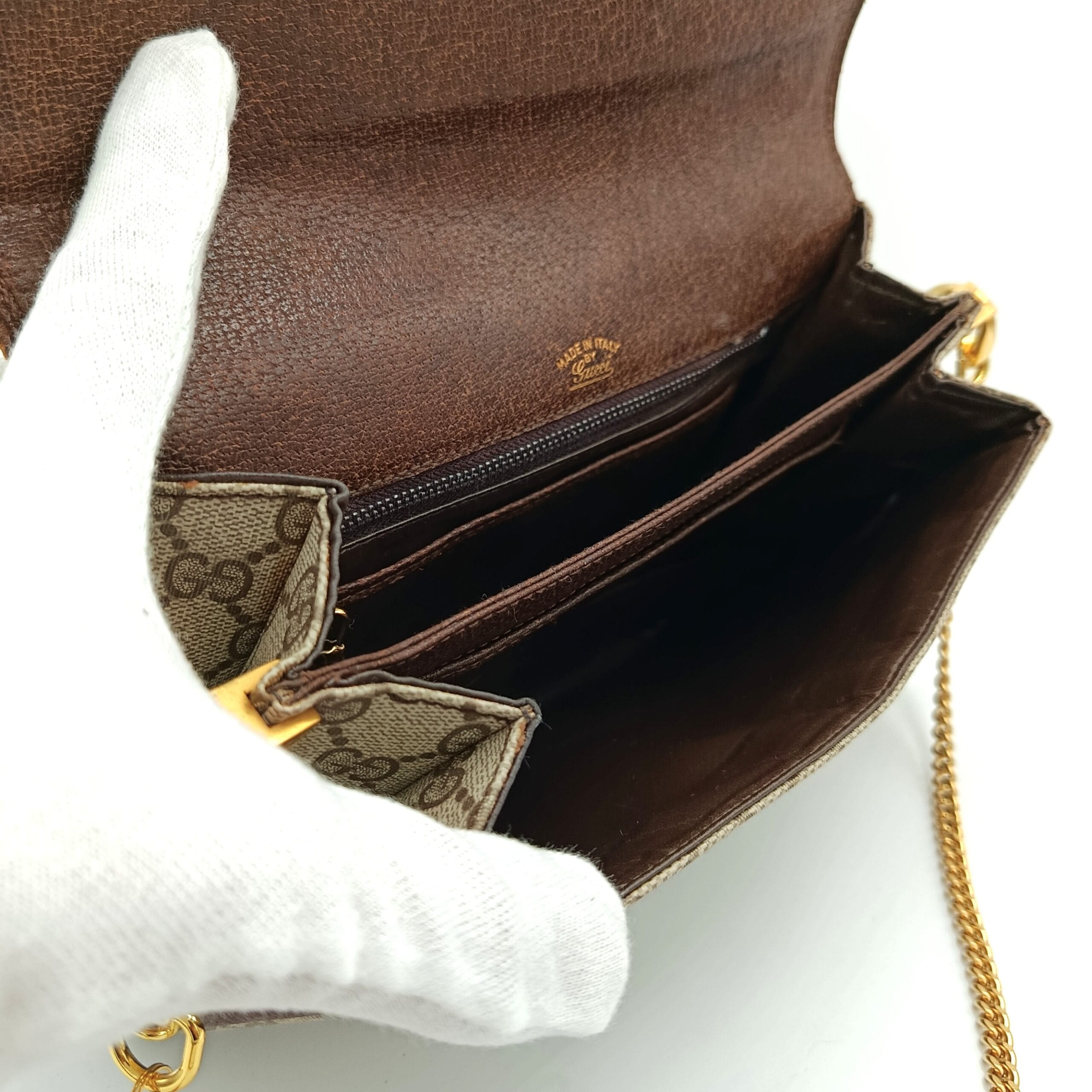 A non-original, removable gold-tone stainless steel chain has been added, allowing the bag to be worn as a shoulder bag or a clutch.