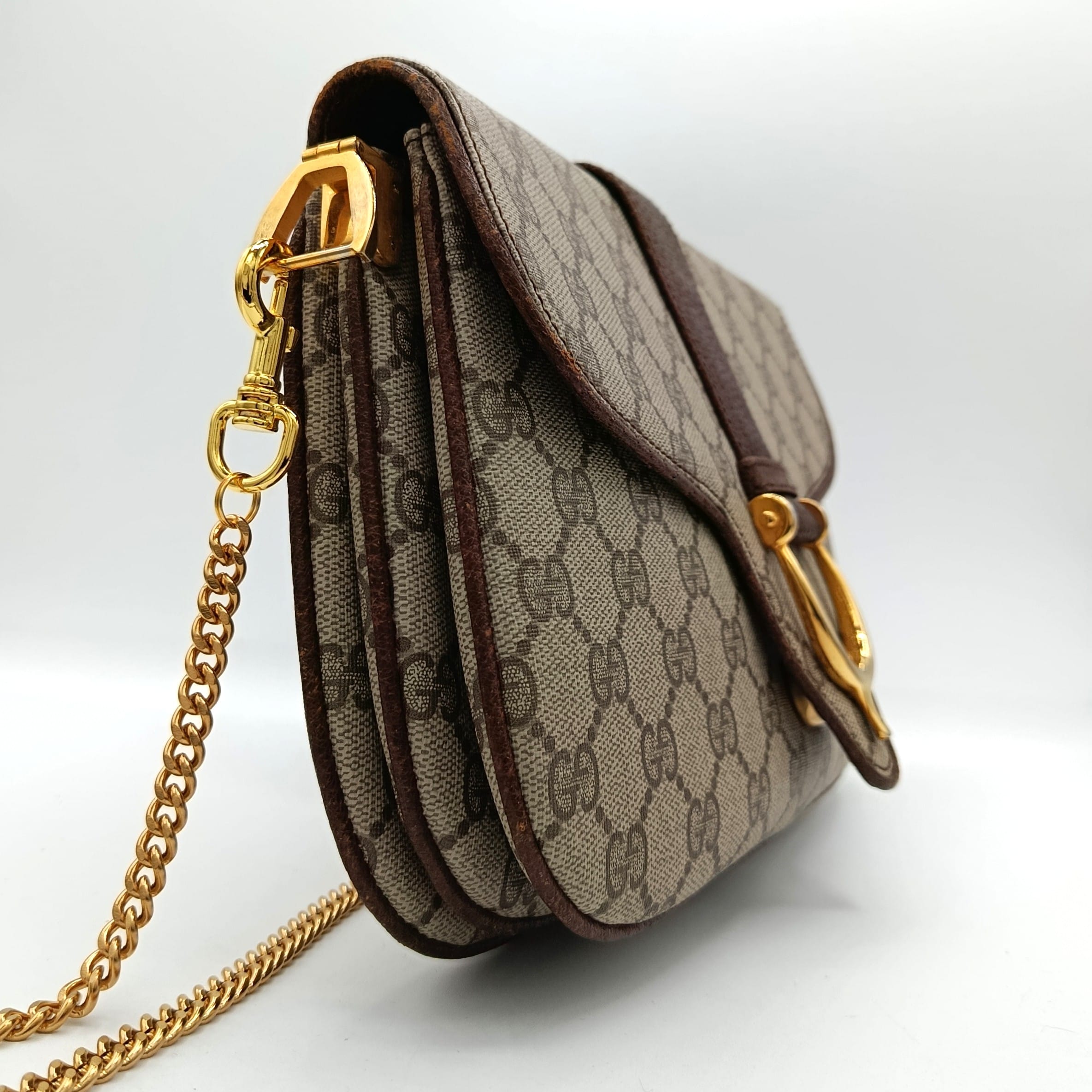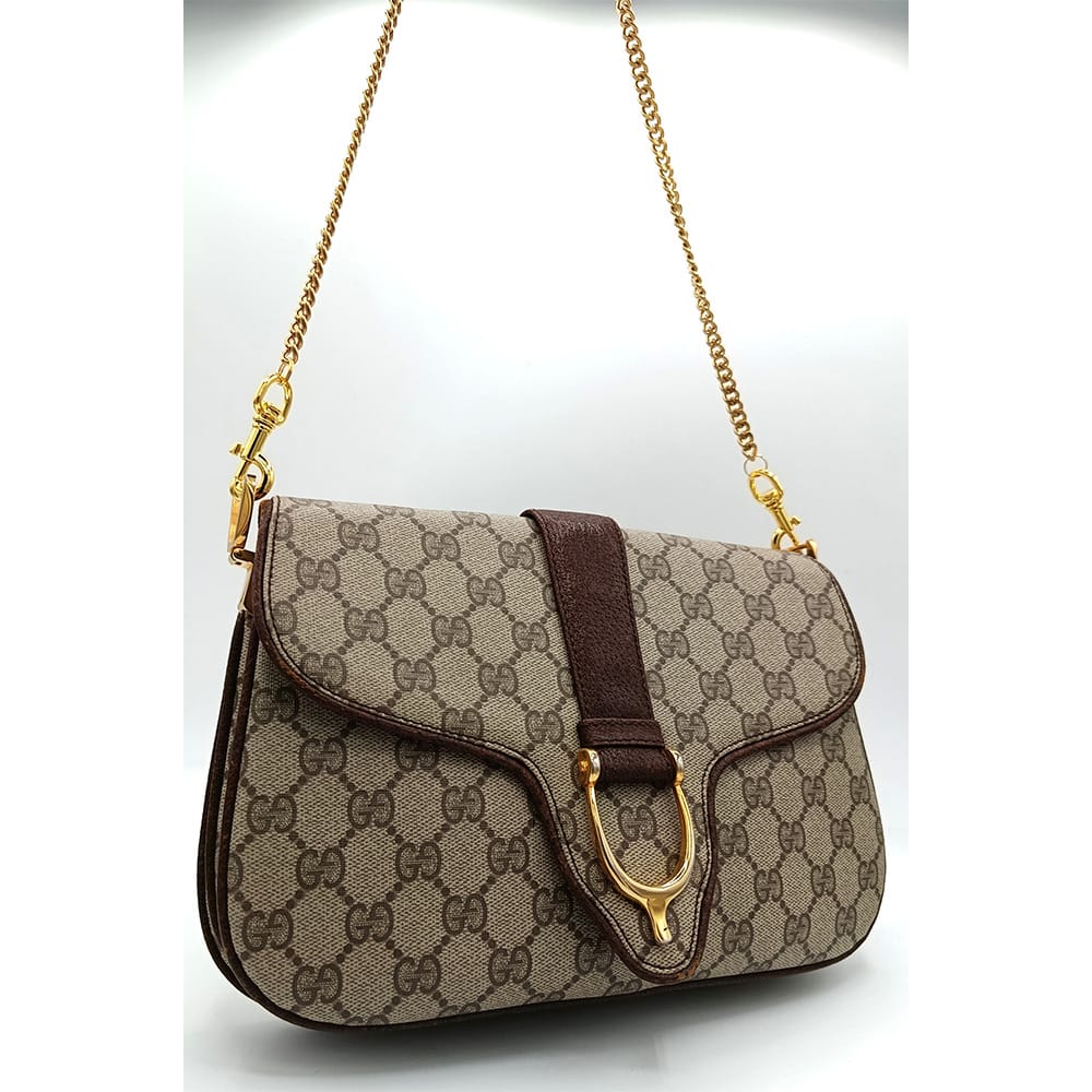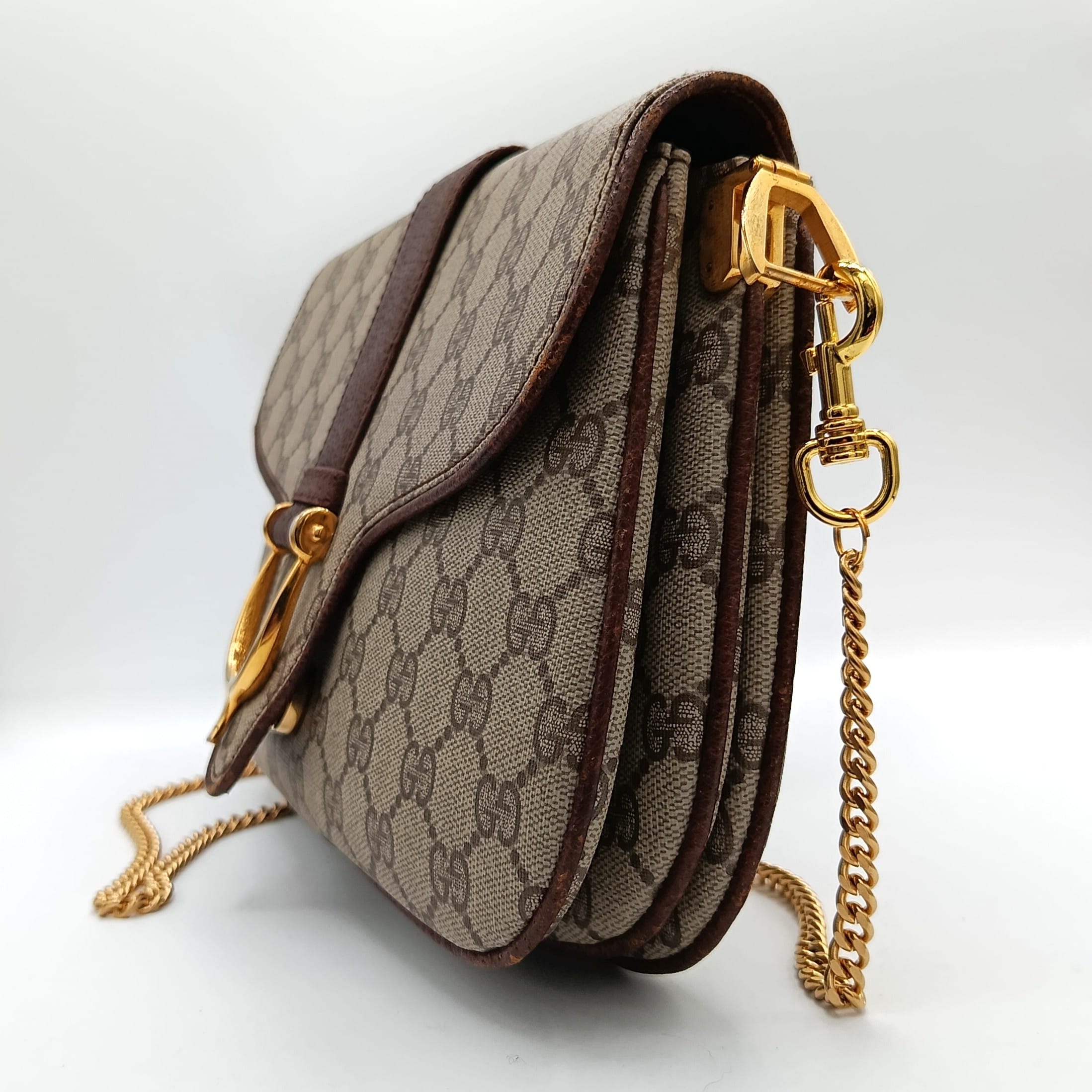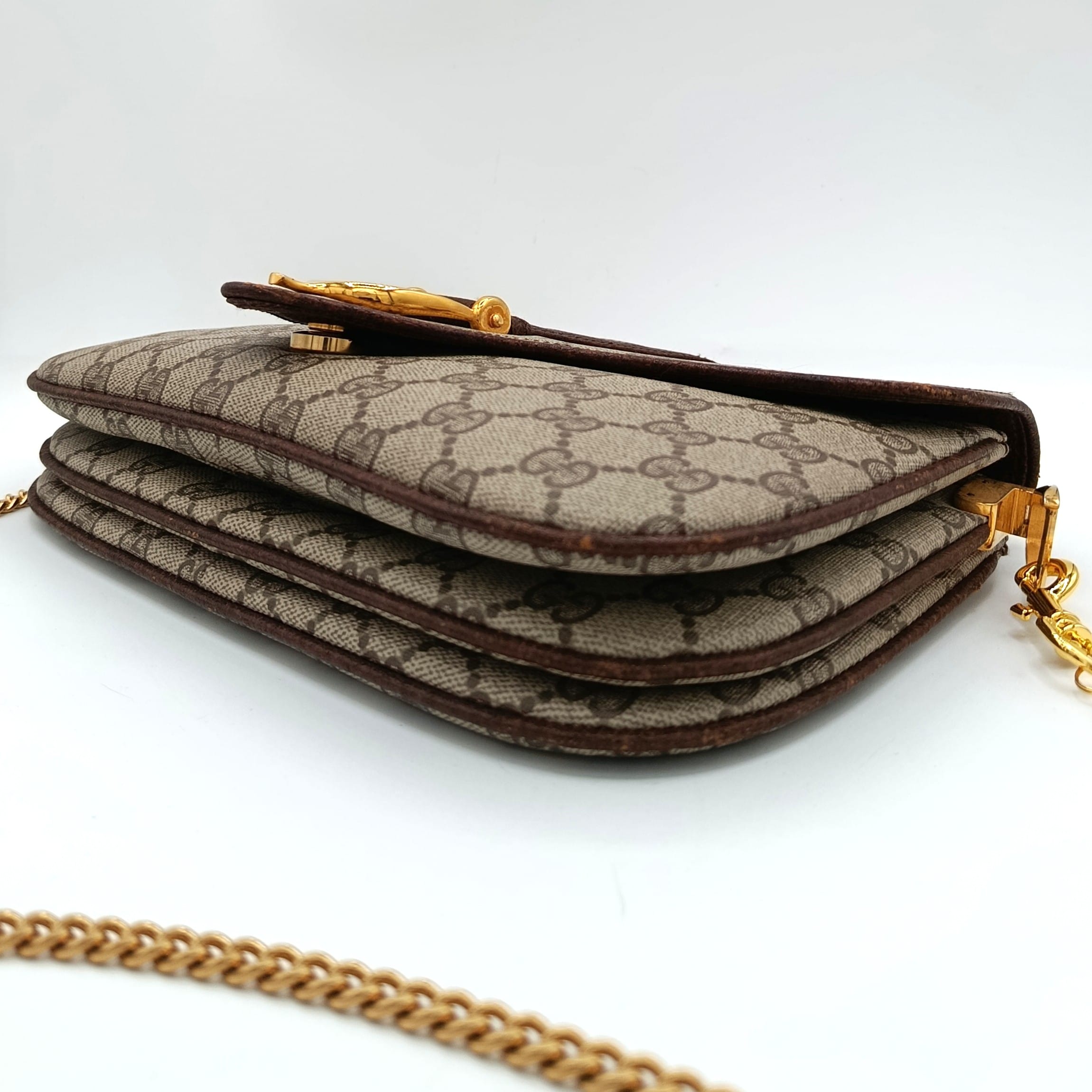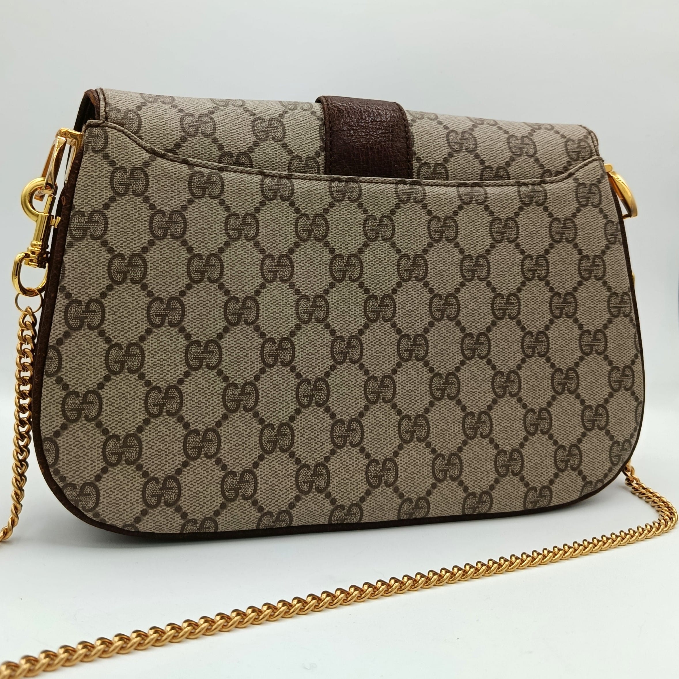 A non-original, removable gold-tone stainless steel chain has been added, allowing the bag to be worn as a shoulder bag or a clutch.