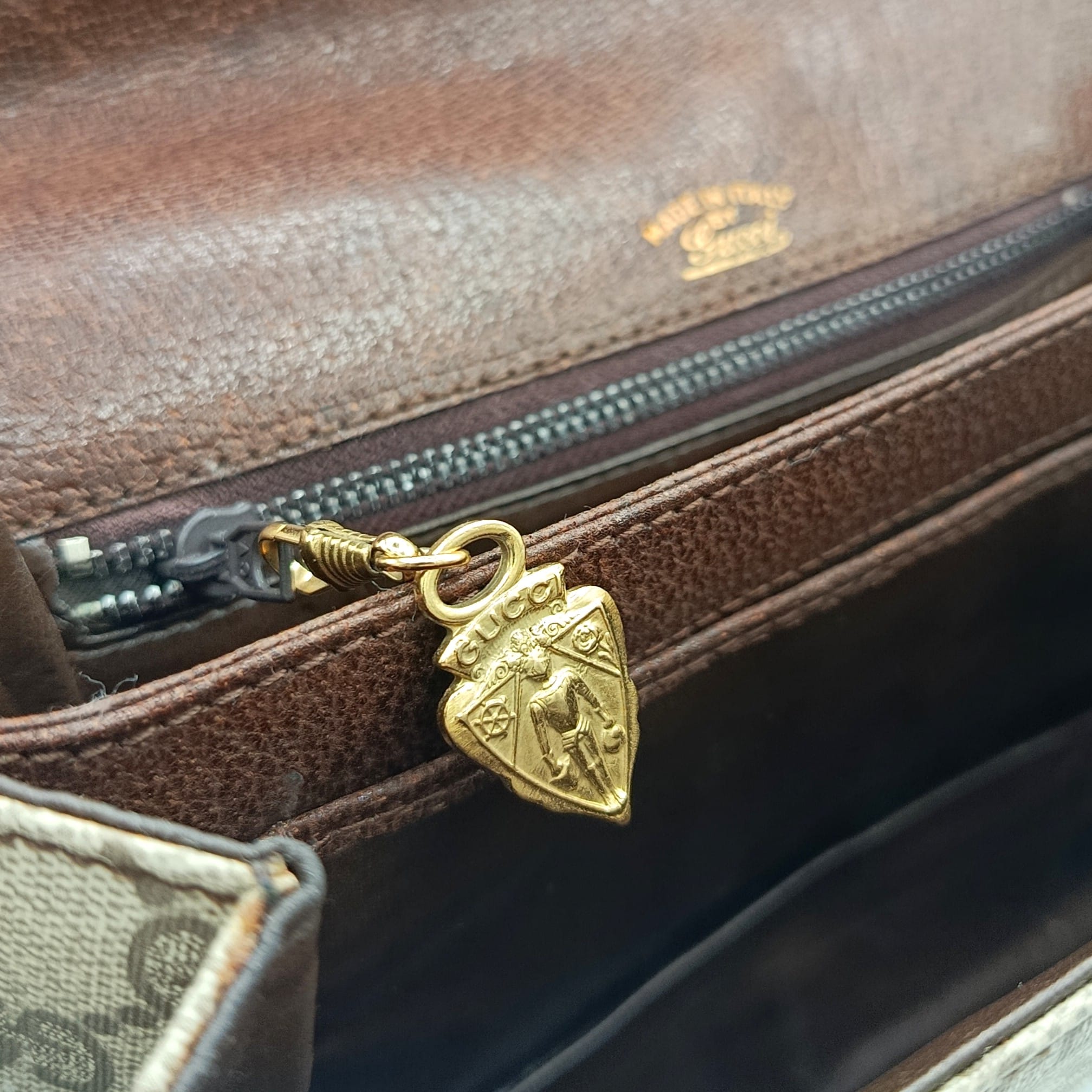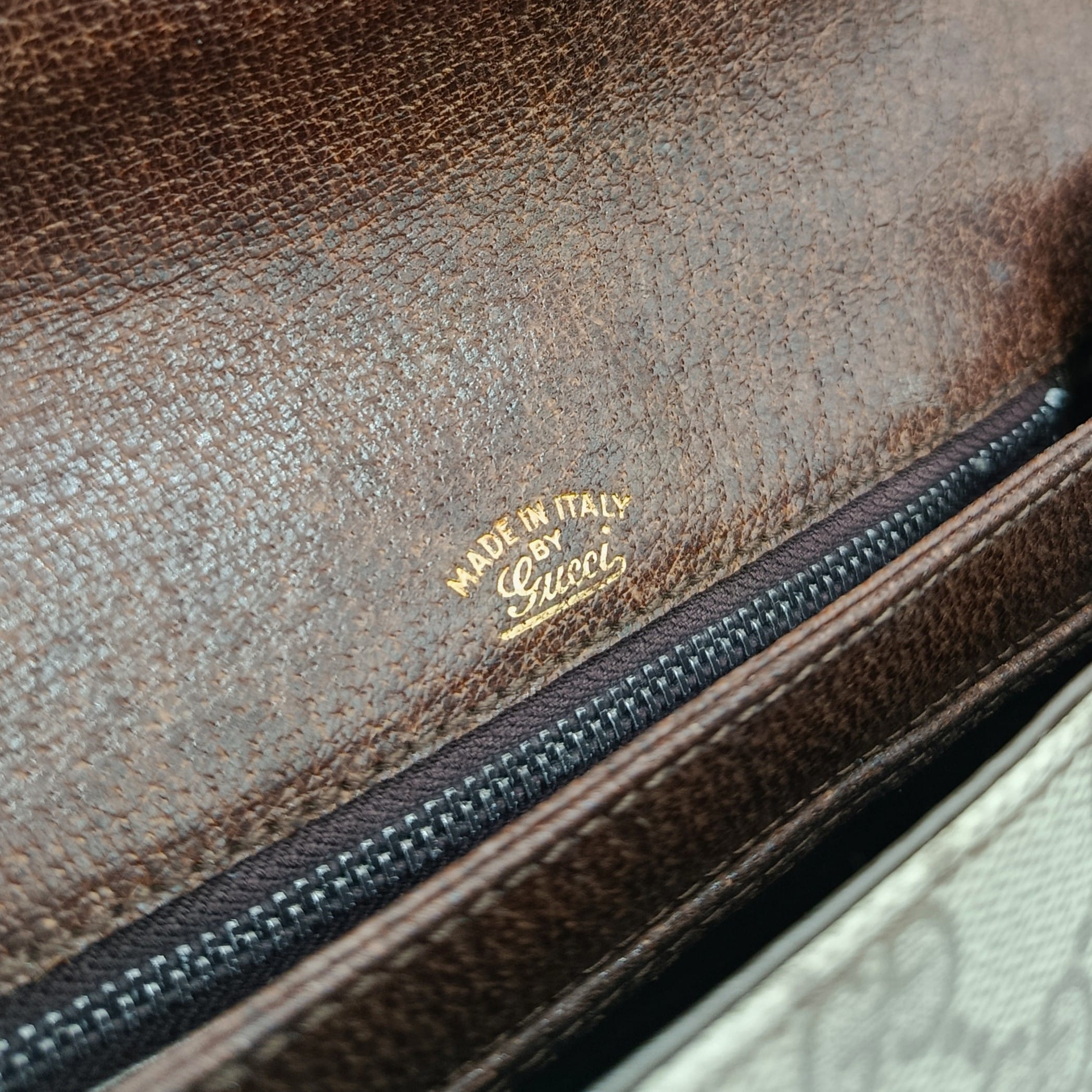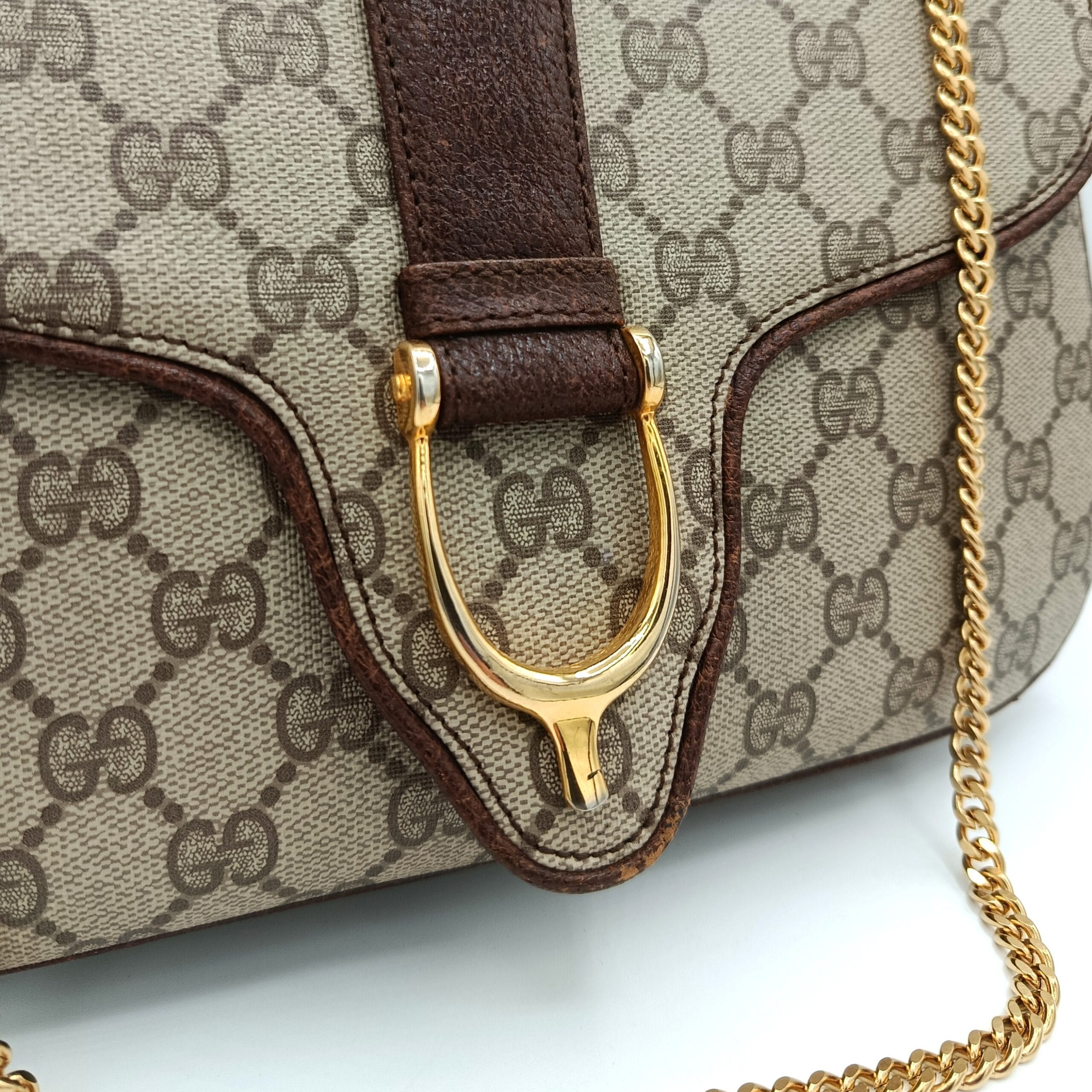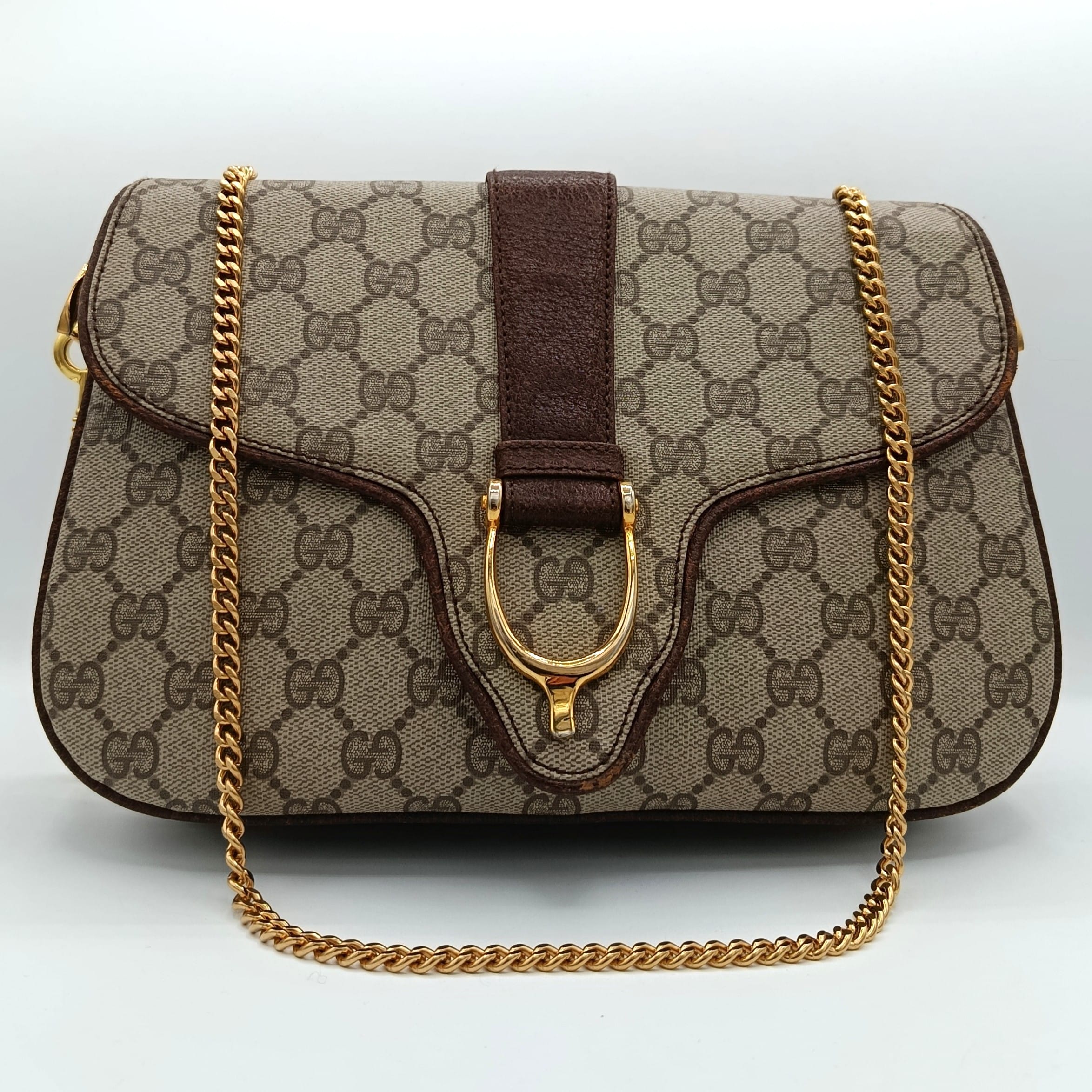 A non-original, removable gold-tone stainless steel chain has been added, allowing the bag to be worn as a shoulder bag or a clutch.