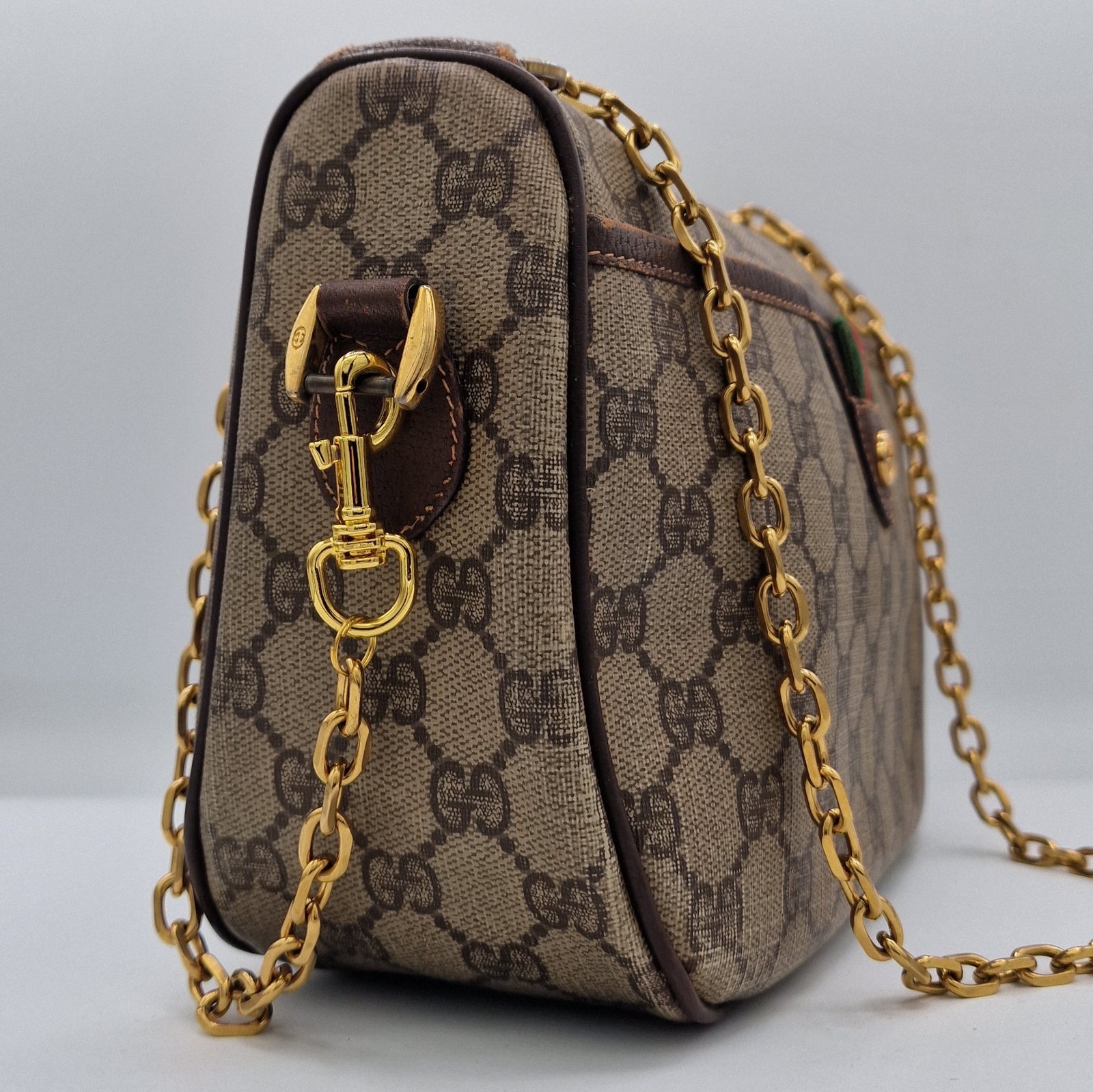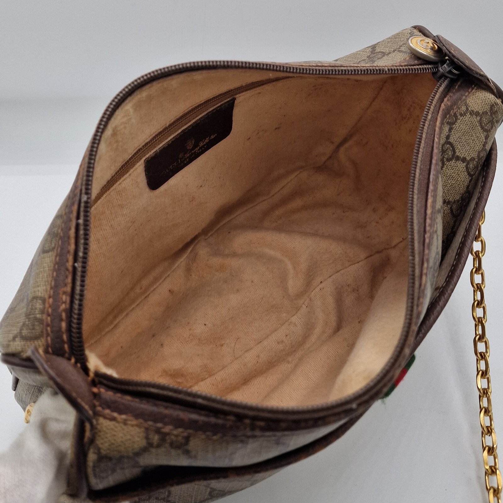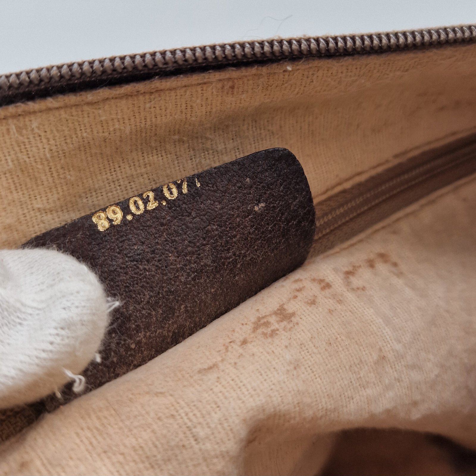 Patina on the leather trim in places, loss of gold plating on the logo.
