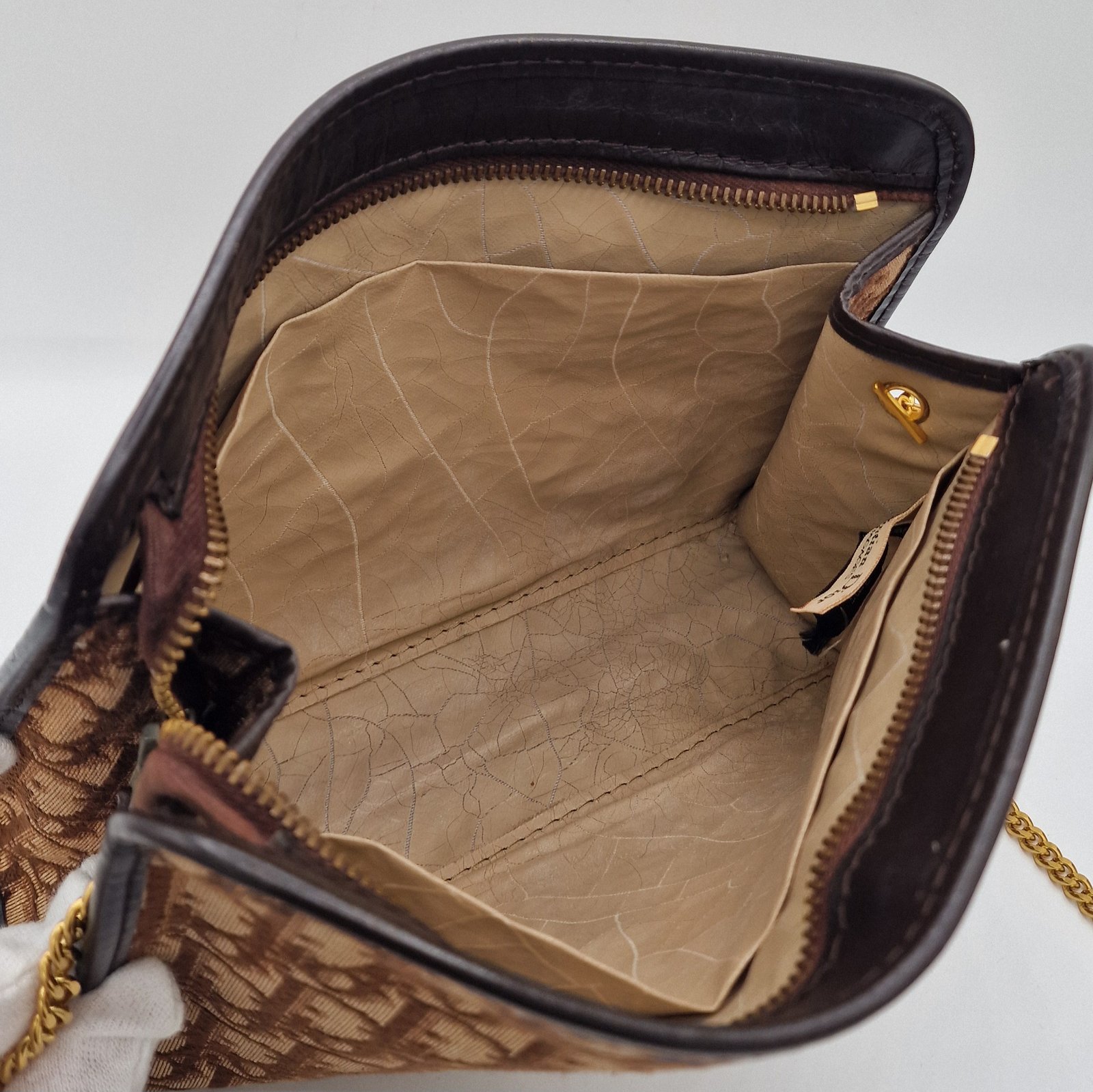 Brown/beige color. Gold hardware.