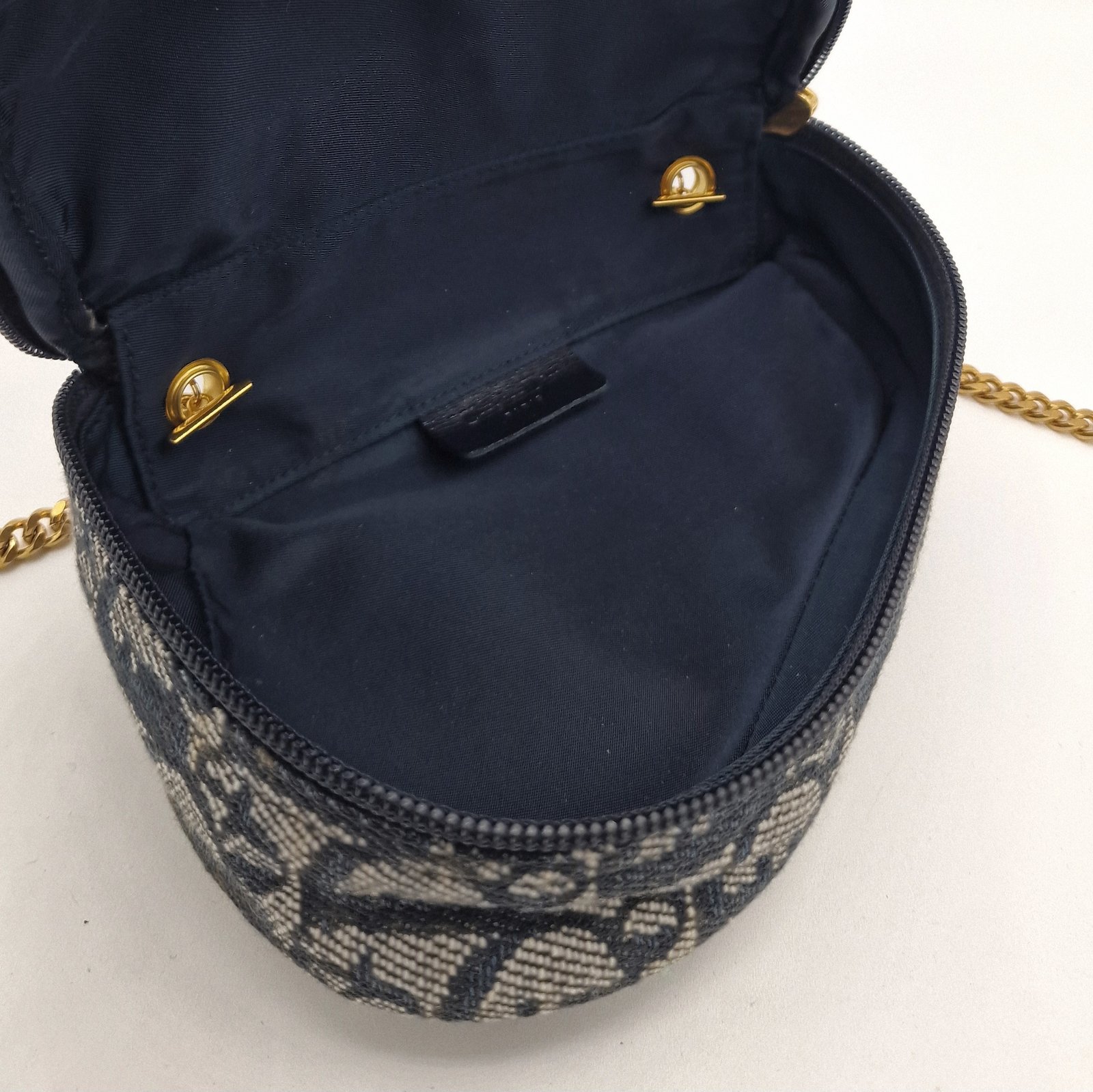 Navy blue interior with zip closure.