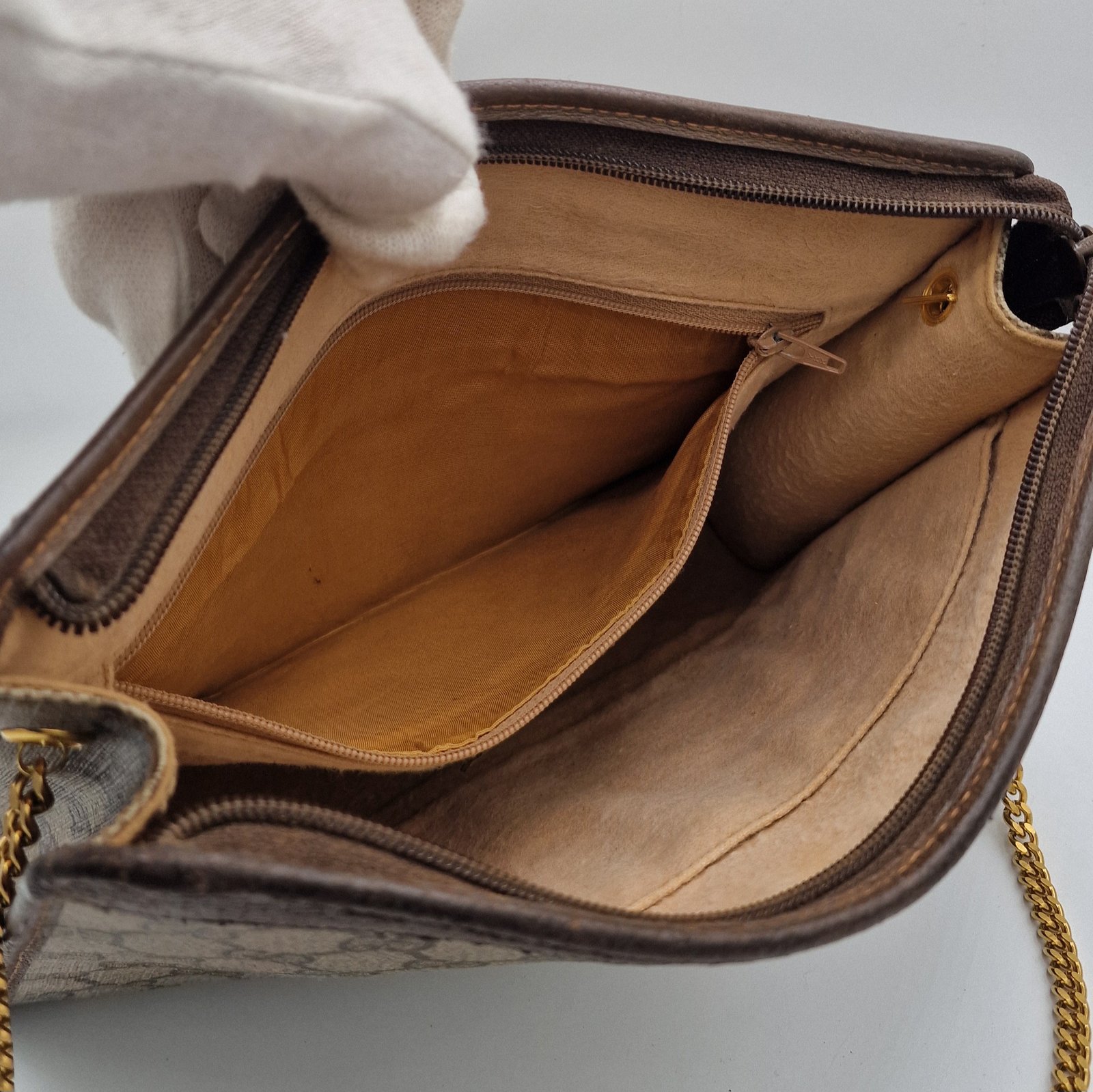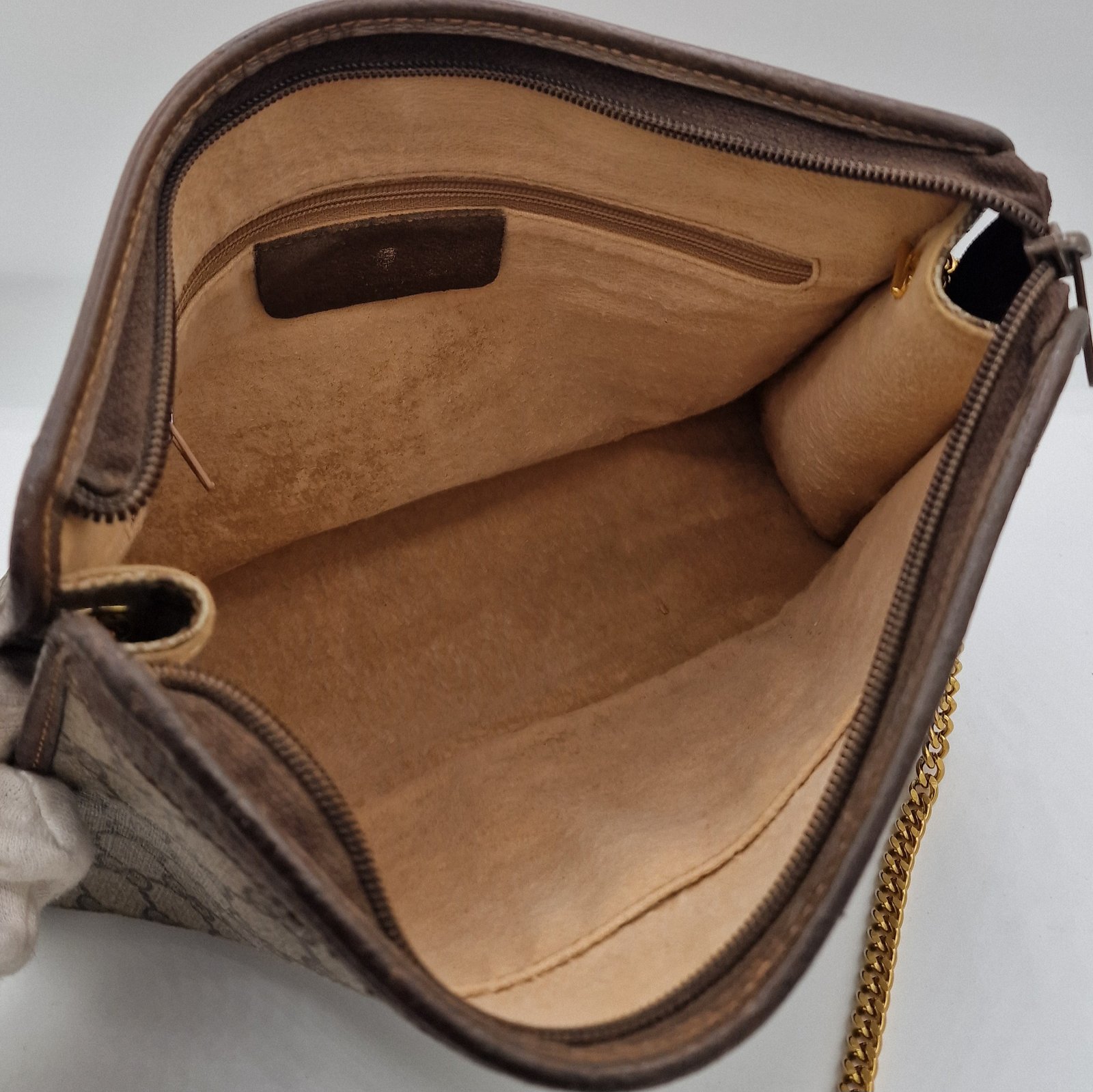 The clutch bag has one large main compartment. Two inside patch pockets, one with a zipper.